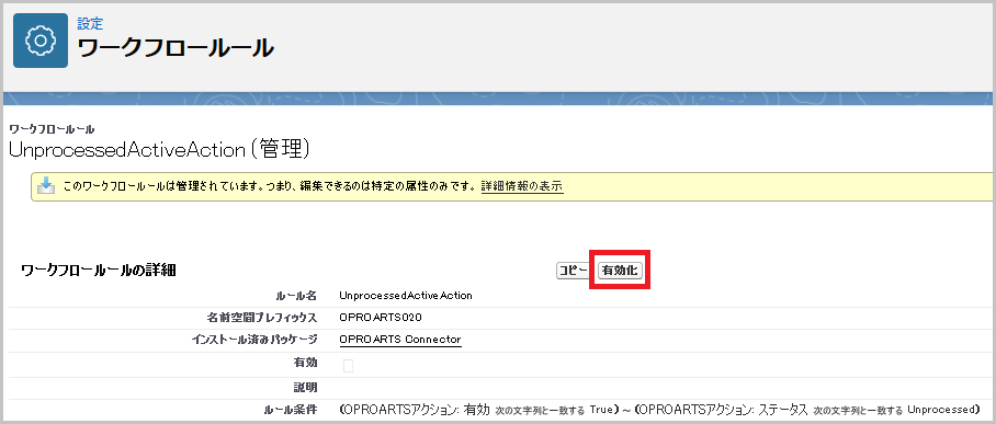 アウトバウンドメッセージは、「OPROARTSアクション」オブジェクトに対して設定されたワークフロールールの条件に合致したときに送信されます。既定で用意されているワークフロールールは以下のものです。