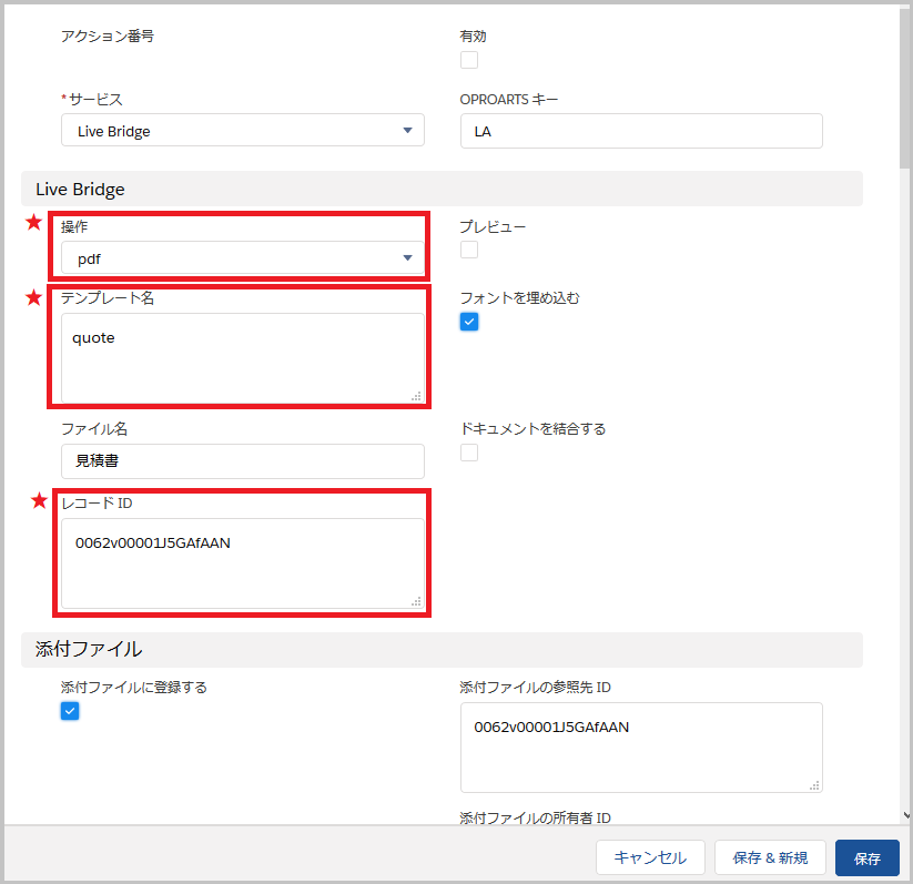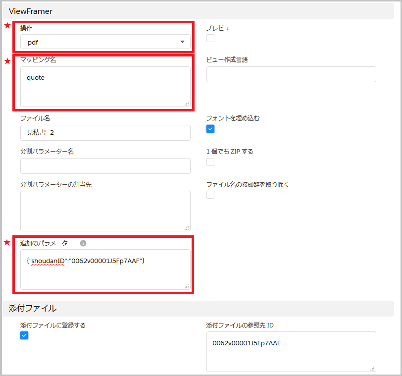 マッピング名とパラメーター名等を書き換えます。以下は、ボタンをクリックした商談レコードに生成した帳票ファイルが添付される例になります。