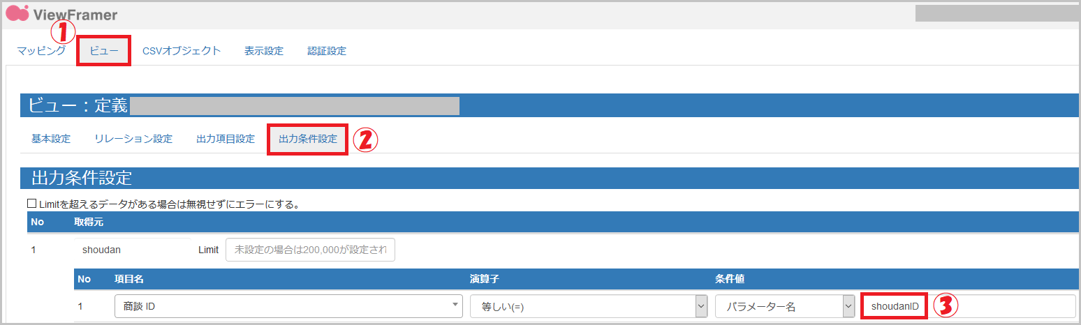 「☆☆☆」の部分は、ViewFramerの①ビュー定義の②出力条件設定で指定した③パラメーター名を指定します。