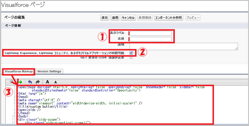 ③[Visualforce Markup]:最初に入っている以下の値をすべて削除してから、