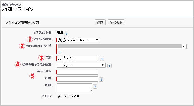 ①[アクション種別]:「カスタム Visualforce」を選択します。