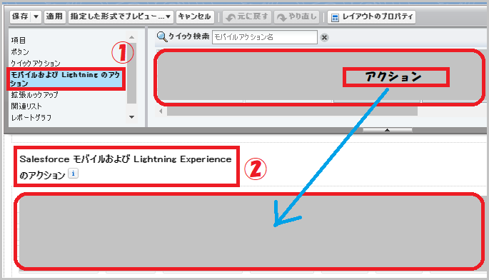 4.①[モバイルおよび Lightning のアクション]の中から作成したアクションを選び、②[Salesforce モバイルおよび Lightning Experience のアクション]にドラッグ&ドロップで配置します。