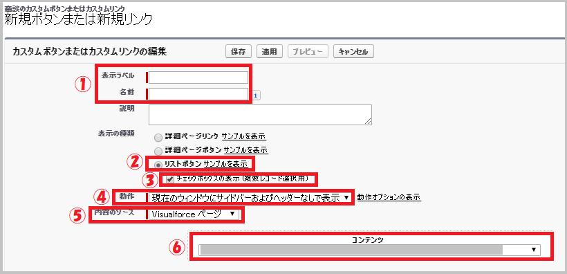 ⑥[コンテンツ]:作成したVisualforceページを選択します。