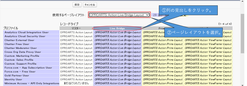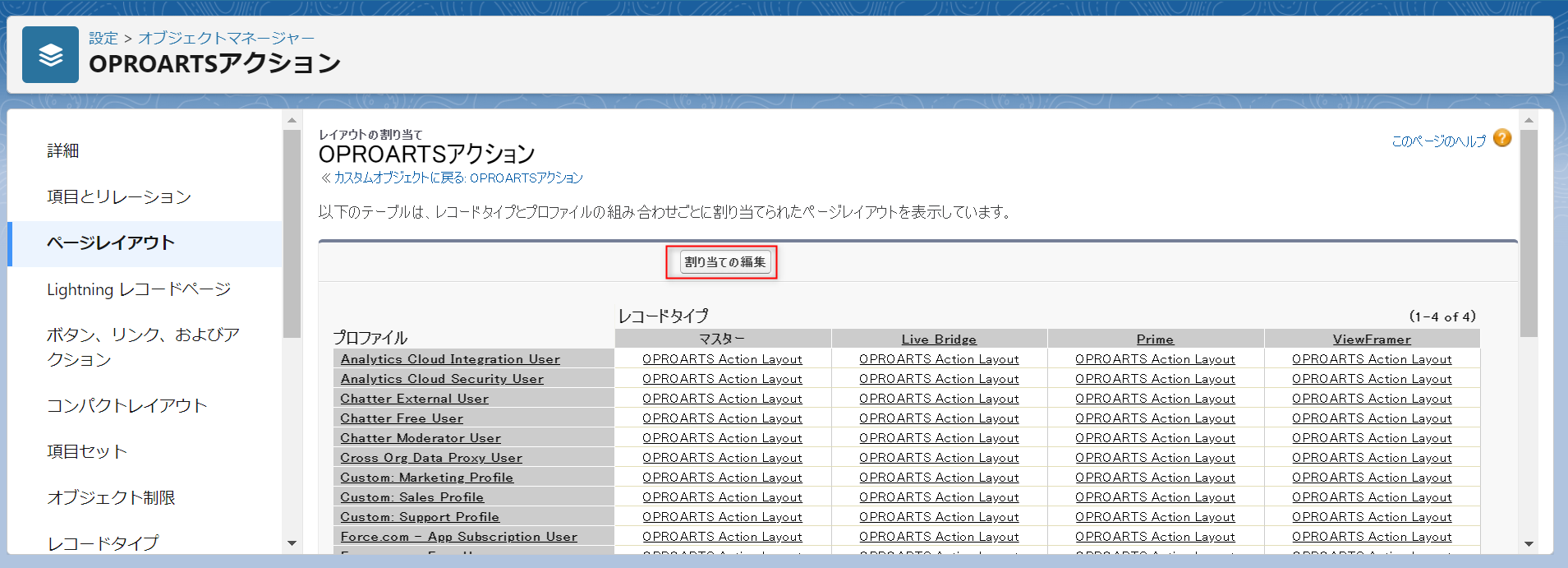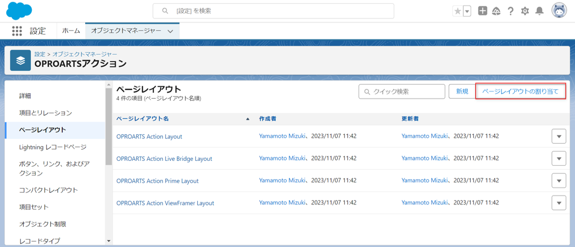 「設定」から「オブジェクトマネージャー」>「OPROARTSアクション」>「ページレイアウト」>「ページレイアウトの割り当て」をクリックします。