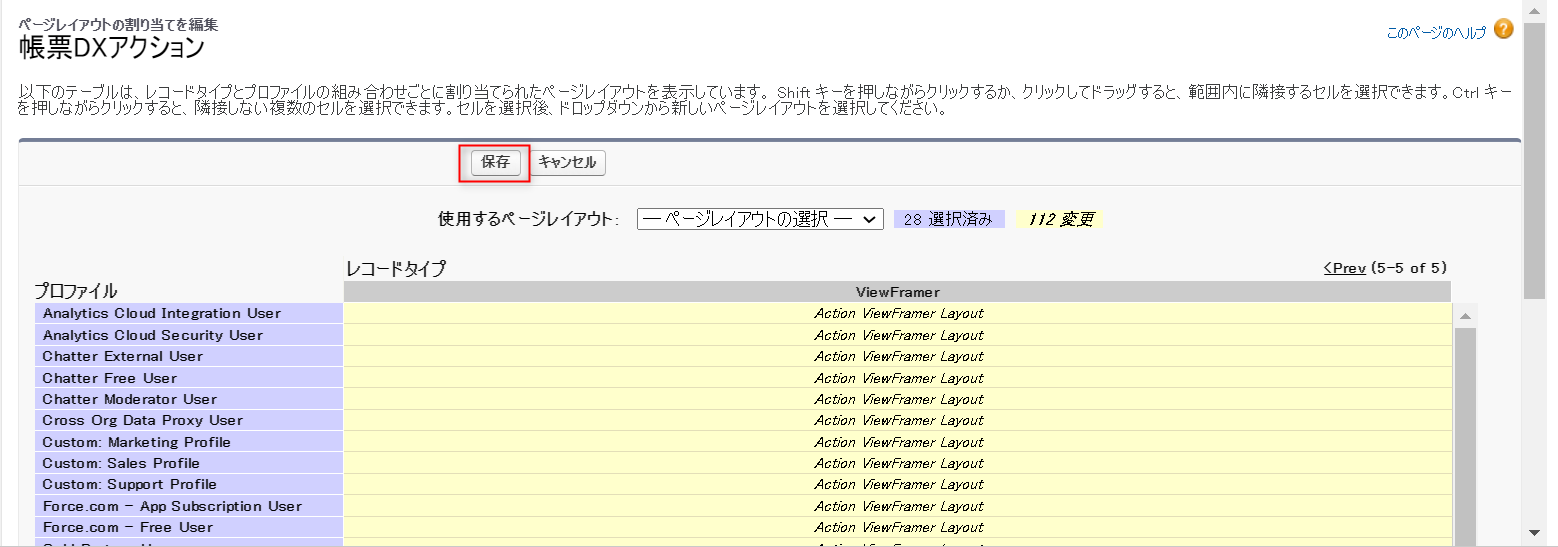 「設定」から「オブジェクトマネージャー」>「帳票DXアクション」>「ページレイアウト」>「ページレイアウトの割り当て」をクリックします。