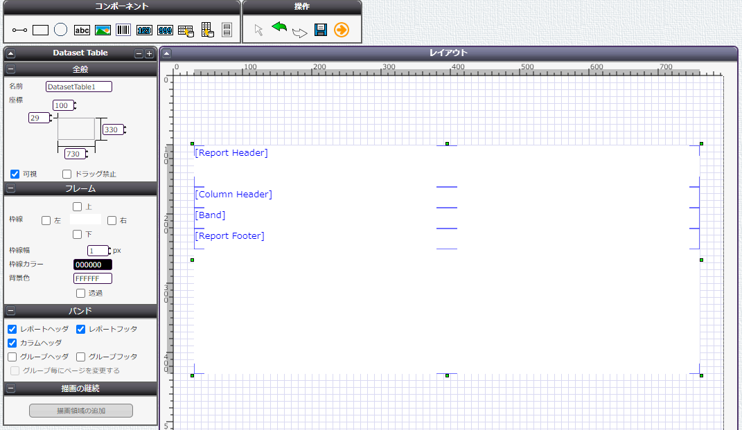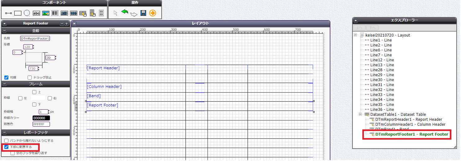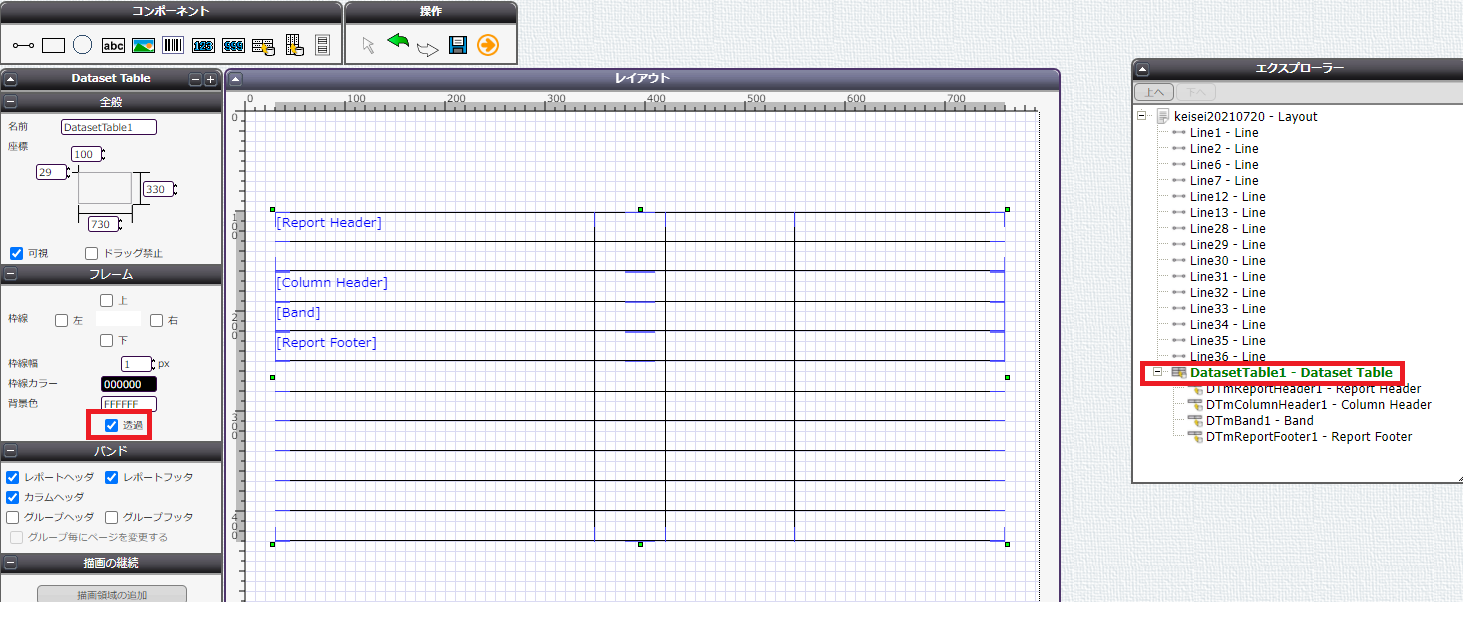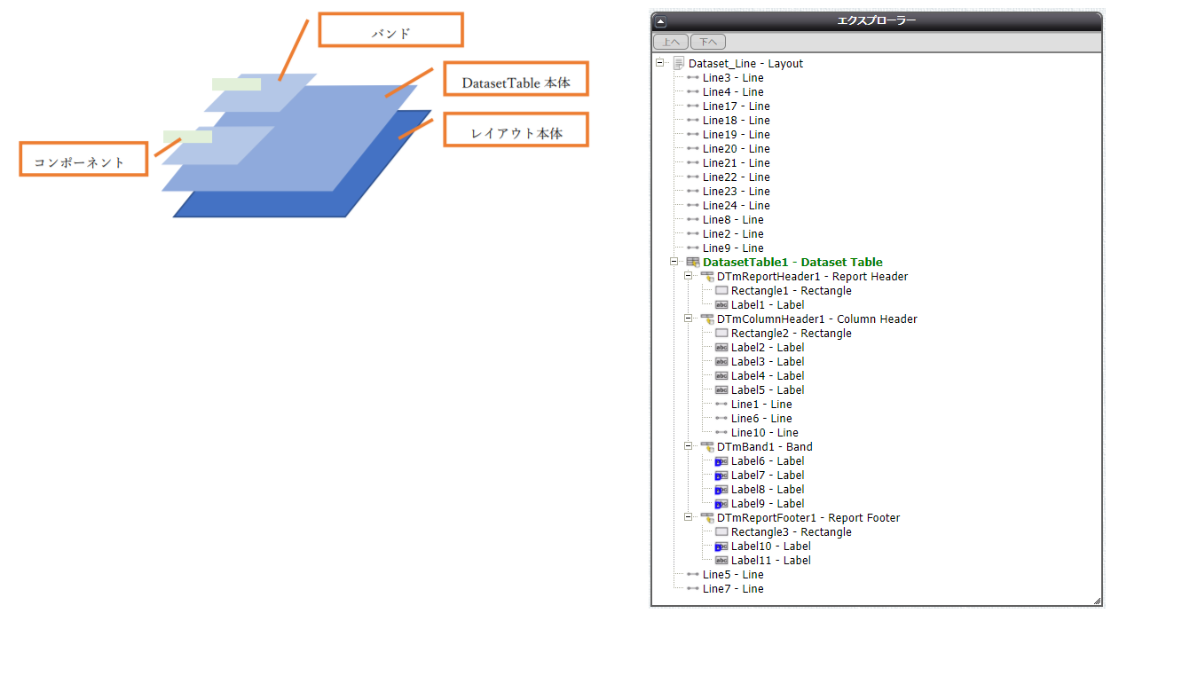 Layout → Dataset Table → Band の順に上に重なっていき、エクスプローラーの上部に表示されるものは帳票として出力されたとき背面に表示されます。