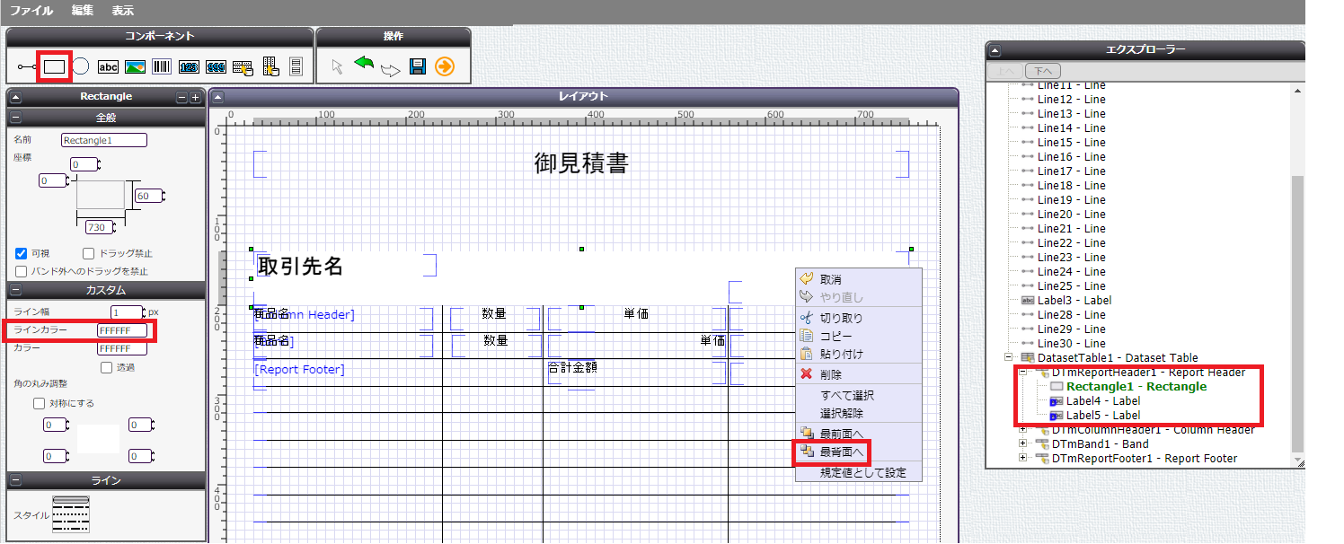 5. レポートヘッダ、レポートフッタの中に、背景色を白に設定したRectangleコンポーネントを配置し、最背面にする。