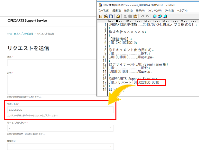 問い合わせフォームに入力する「サポートID」には、ステップ①で送付された認証情報テキストに記載されているCIDを入力してください。