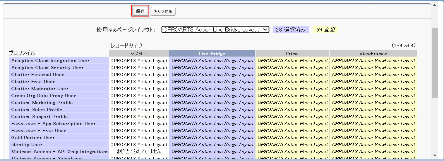 「設定」から「オブジェクトマネージャー」>「OPROARTSアクション」>「ページレイアウト」>「ページレイアウトの割り当て」をクリックします。