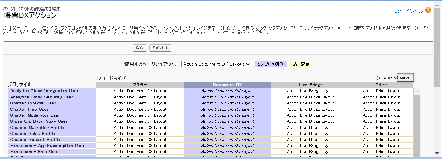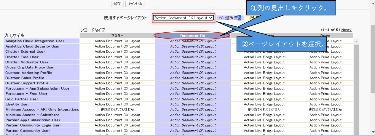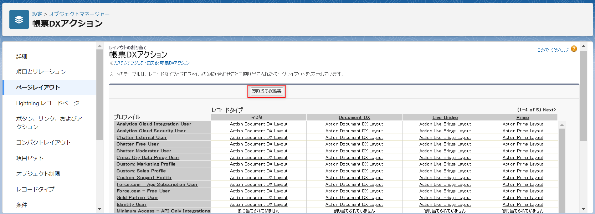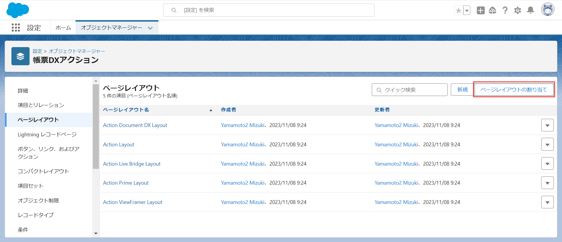 「設定」から「オブジェクトマネージャー」>「帳票DXアクション」>「ページレイアウト」>「ページレイアウトの割り当て」をクリックします。