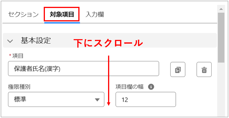 3.[対象項目]タブを開いて一番下までスクロールします。