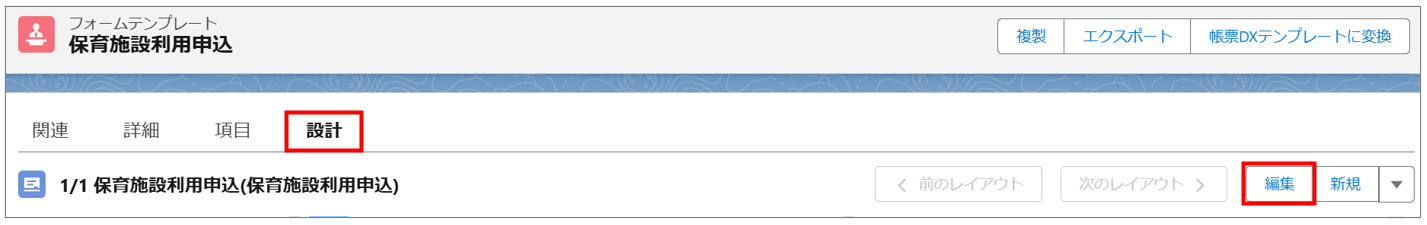 1.設定を行う「フォームテンプレート」レコードを開き、[設計]タブの[編集]ボタンをクリックします。