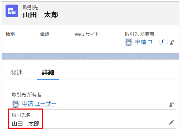 申請書類に入力された値を別のオブジェクトのレコードとして登録することが可能です。 例えば、「保護者氏名(漢字)」項目を「取引先」オブジェクトの「取引先名」項目と紐づけた場合は以下の動作になります。
