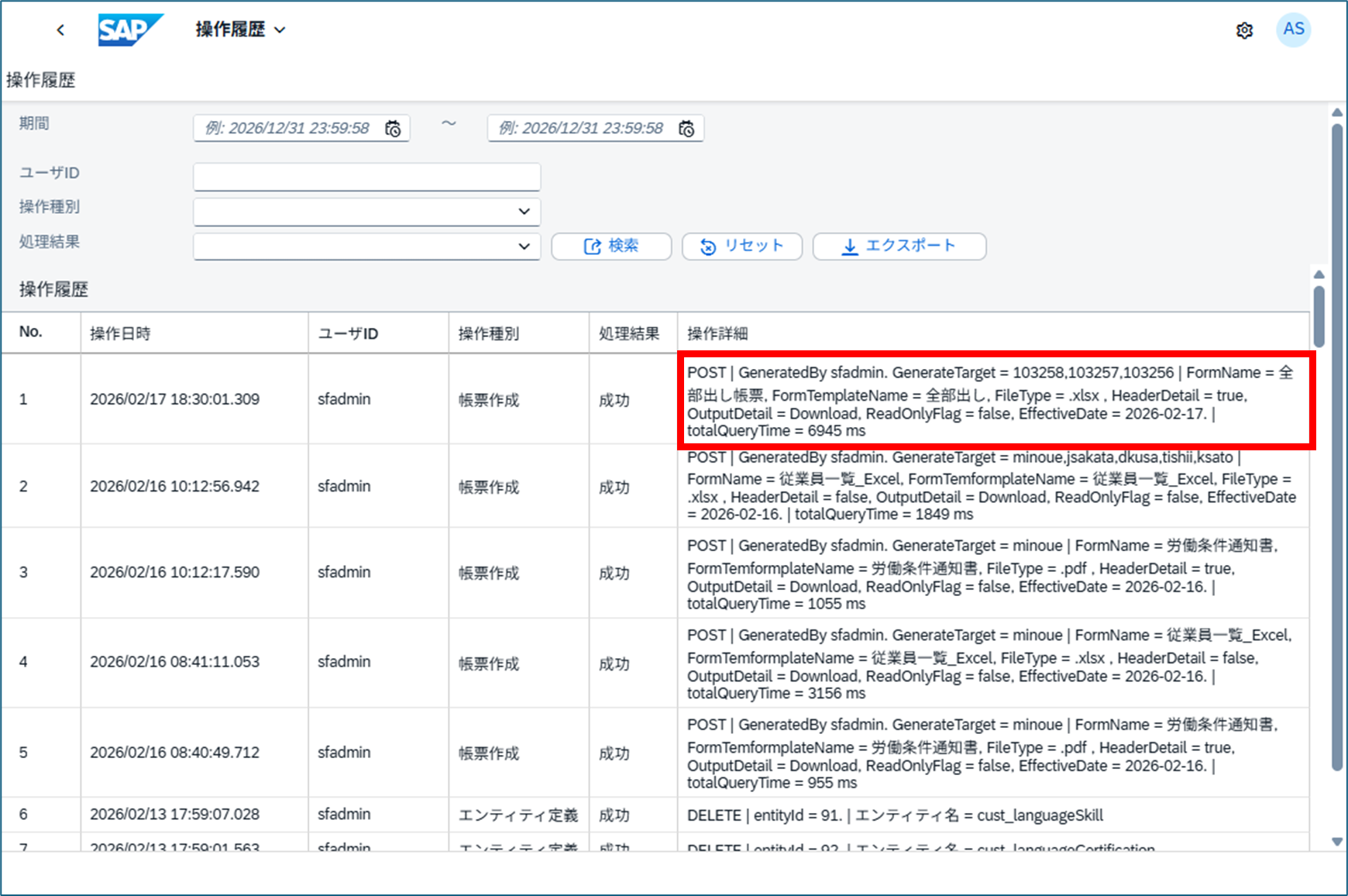 | totalQueryTime | 帳票作成に要した時間(ミリ秒) |
