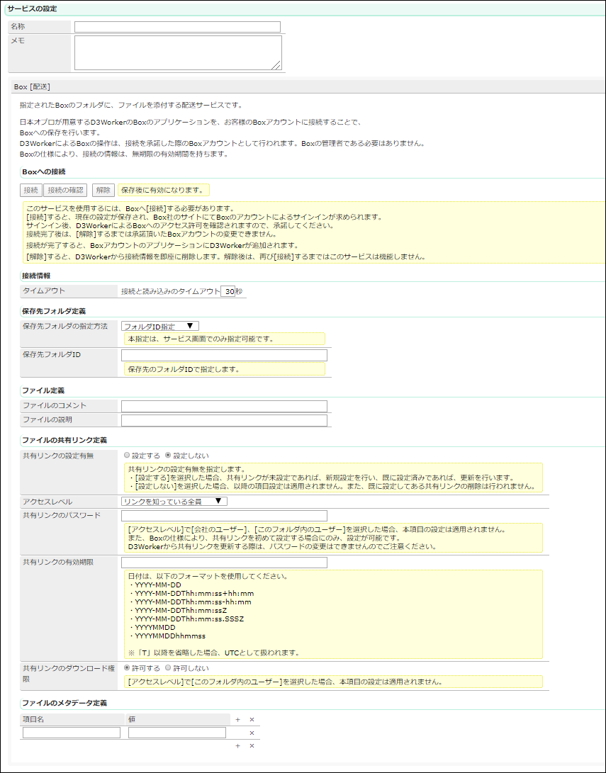 | タイムアウト | ○ | D3Worker - Box間の接続・読込における、タイムアウトするまでの時間を指定します。 |