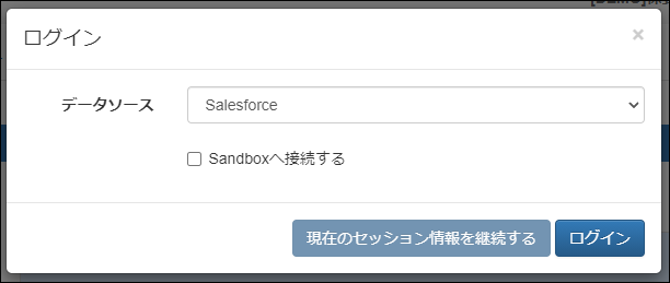 画面右下の「次へ」をクリックするとSalesforceへのログインを促されるため、既にSalesforceへのログインを済ませていれば「現在のセッションを使用」、ログインしていなければ「ログイン」をクリックしてSalesforceにログインします。
