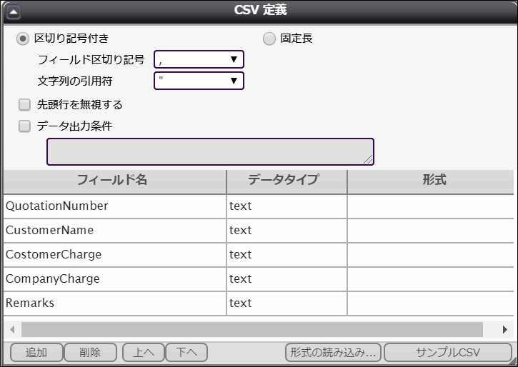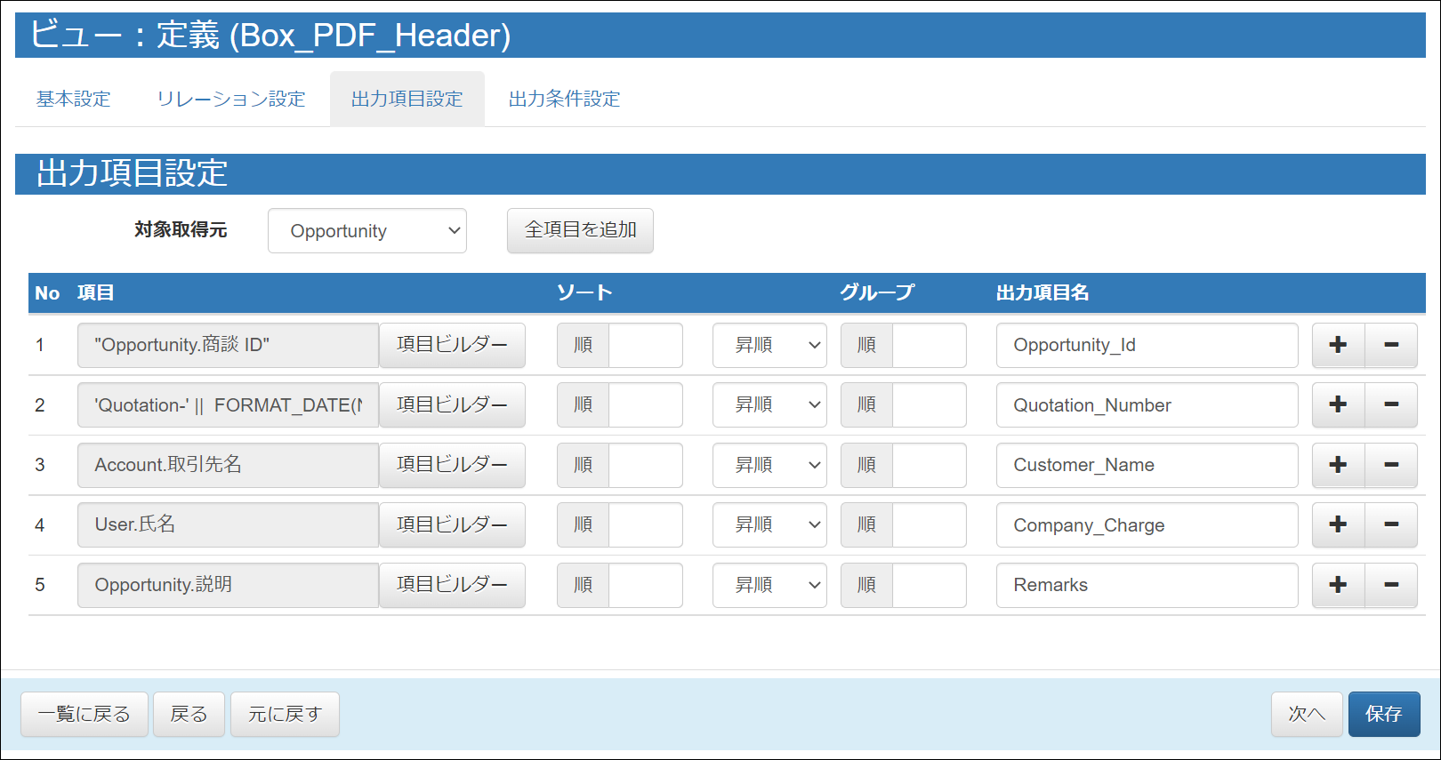出力項目名はそれぞれ「Opportunity_Id」「Quotation_Number」「Customer_Name」「Company_Charge」「Remarks」とします。
