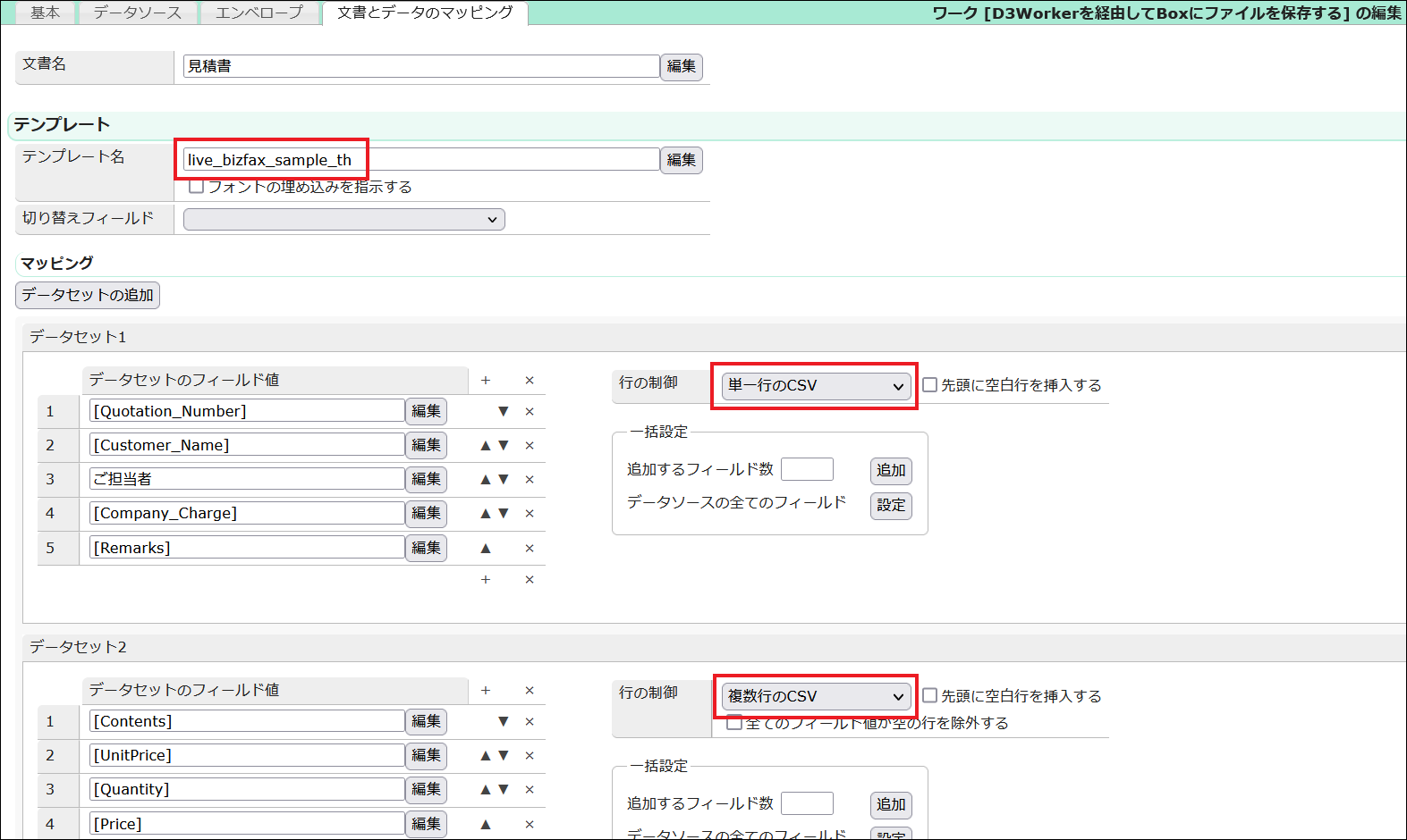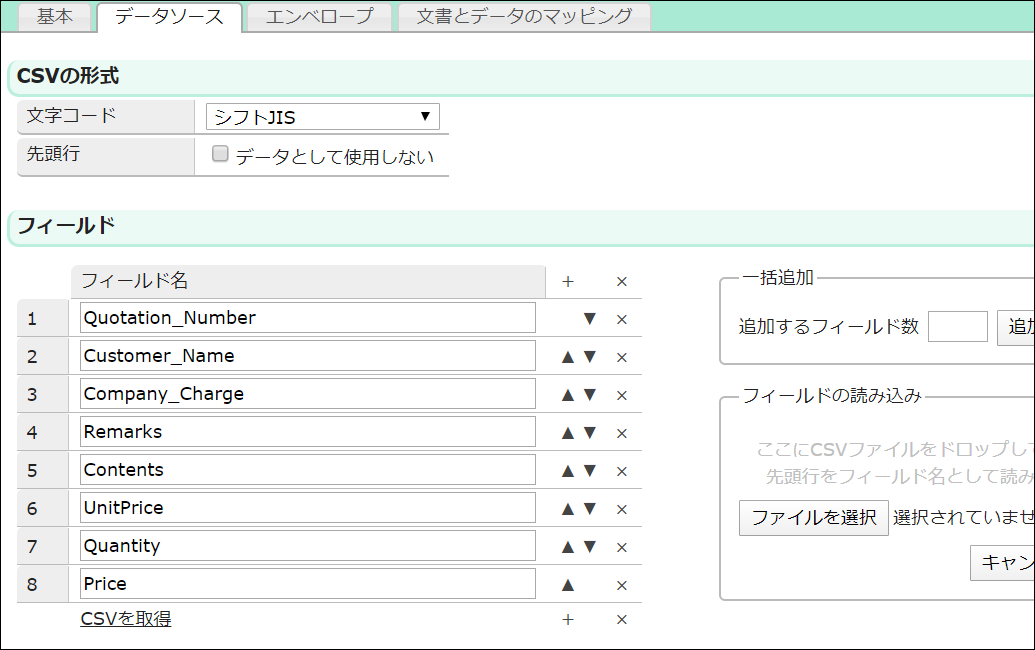 文書とデータのマッピング: 帳票テンプレートのCSVフィールドと、データソースのフィールドをマッピングします。