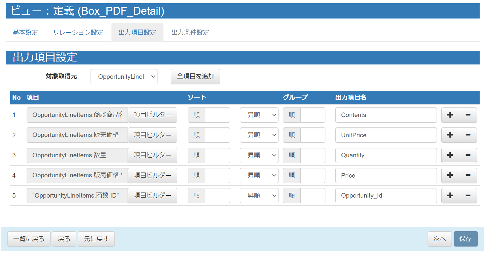出力項目名はそれぞれ「Contents」「UnitPrice」「Quantity」「Price」「Opportunity_Id」とします。