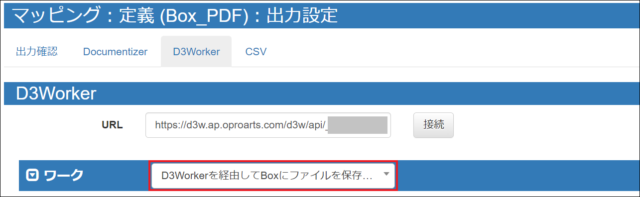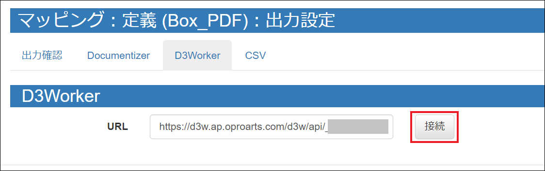 D3Workerタブへ移動し、URLに以下を入力して「接続」をクリックします。