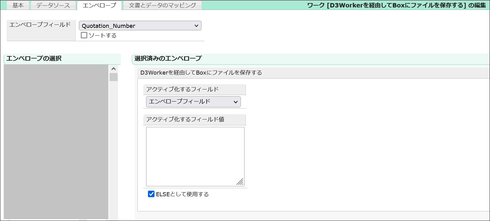 エンベロープ: 作成したエンベロープを選択し、「エンベロープフィールド」に帳票を区別するデータフィールド(ここではQuotation_Number)を、「アクティブ化するフィールド」にエンベロープフィールドを指定します。また「ELSEとして使用する」にチェックを入れます。