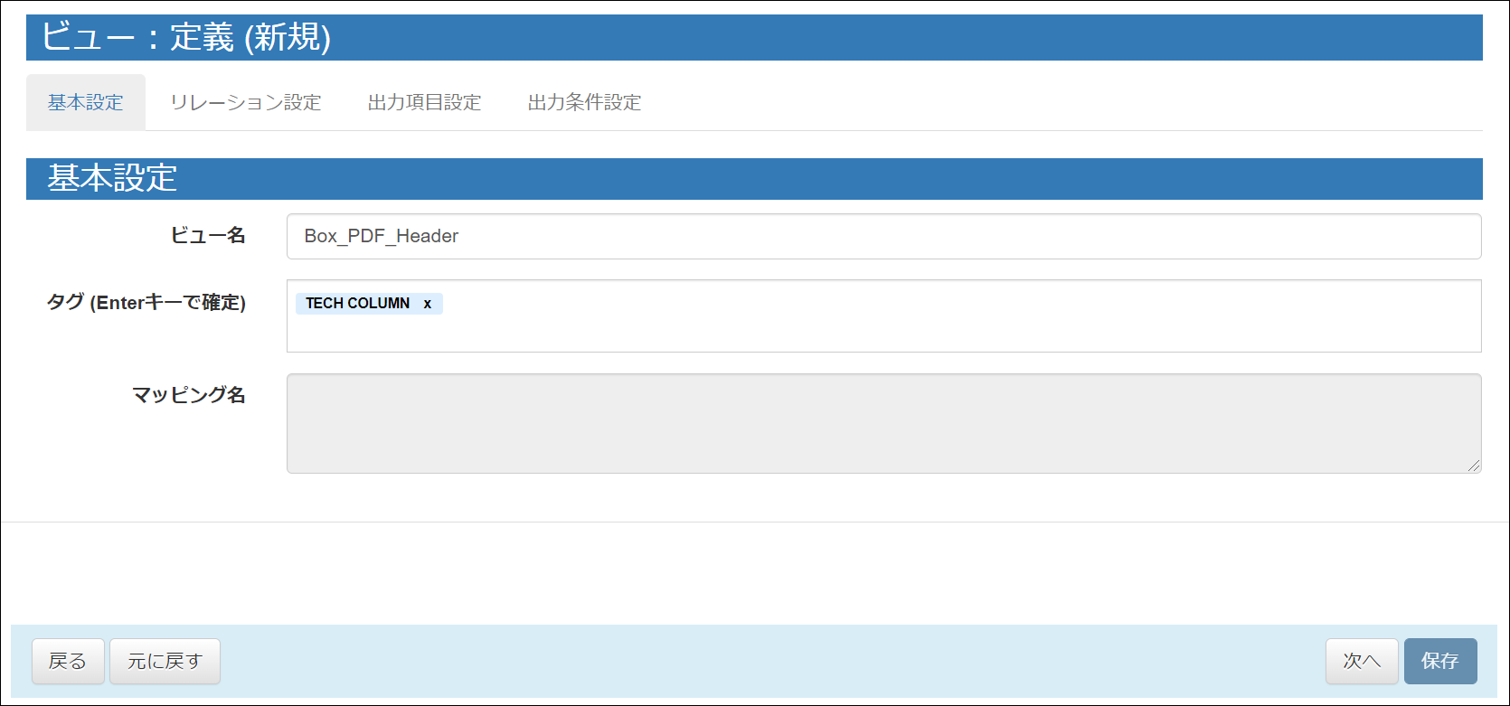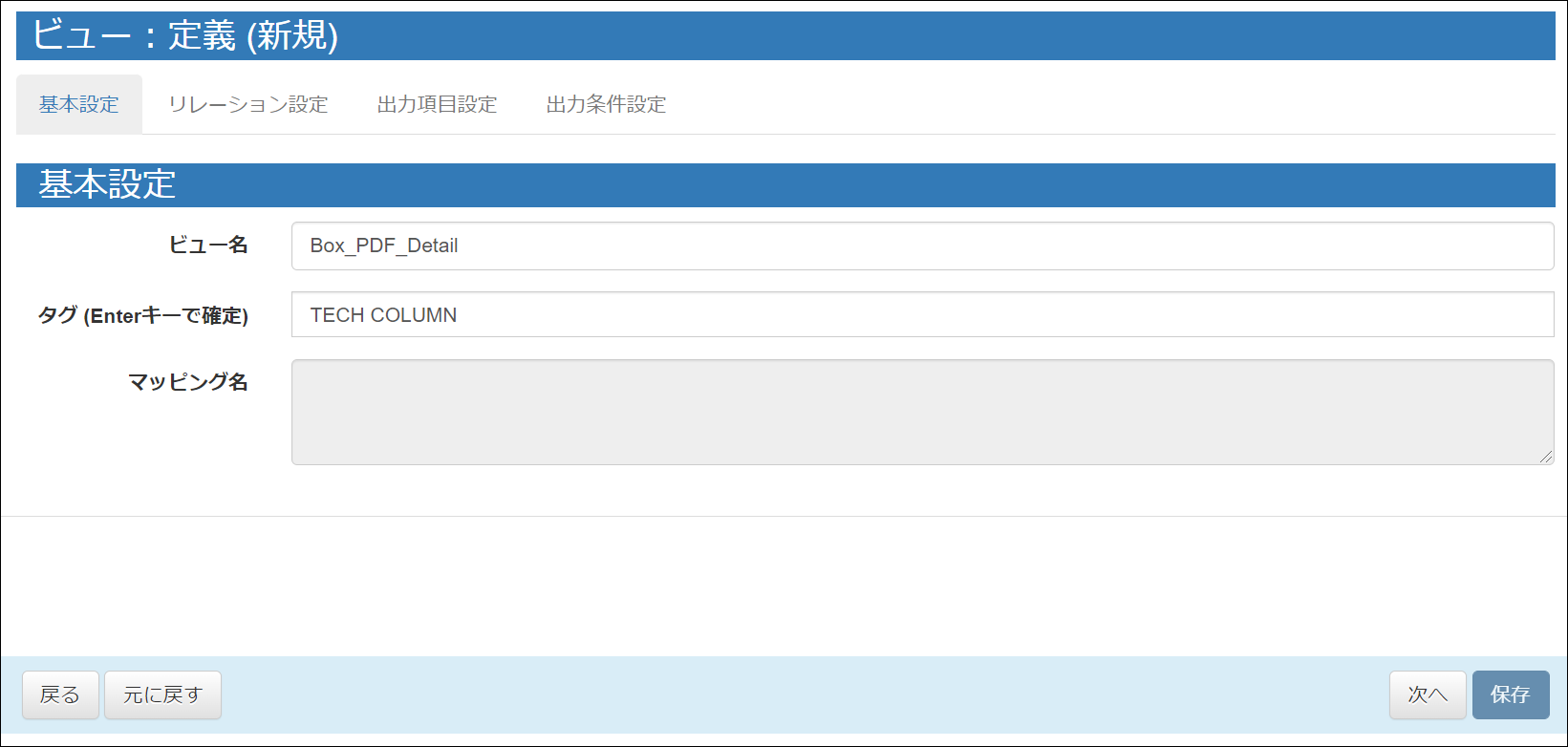 ビューの新規作成画面を開き、ビューの名前を入力して「次へ」をクリックします。