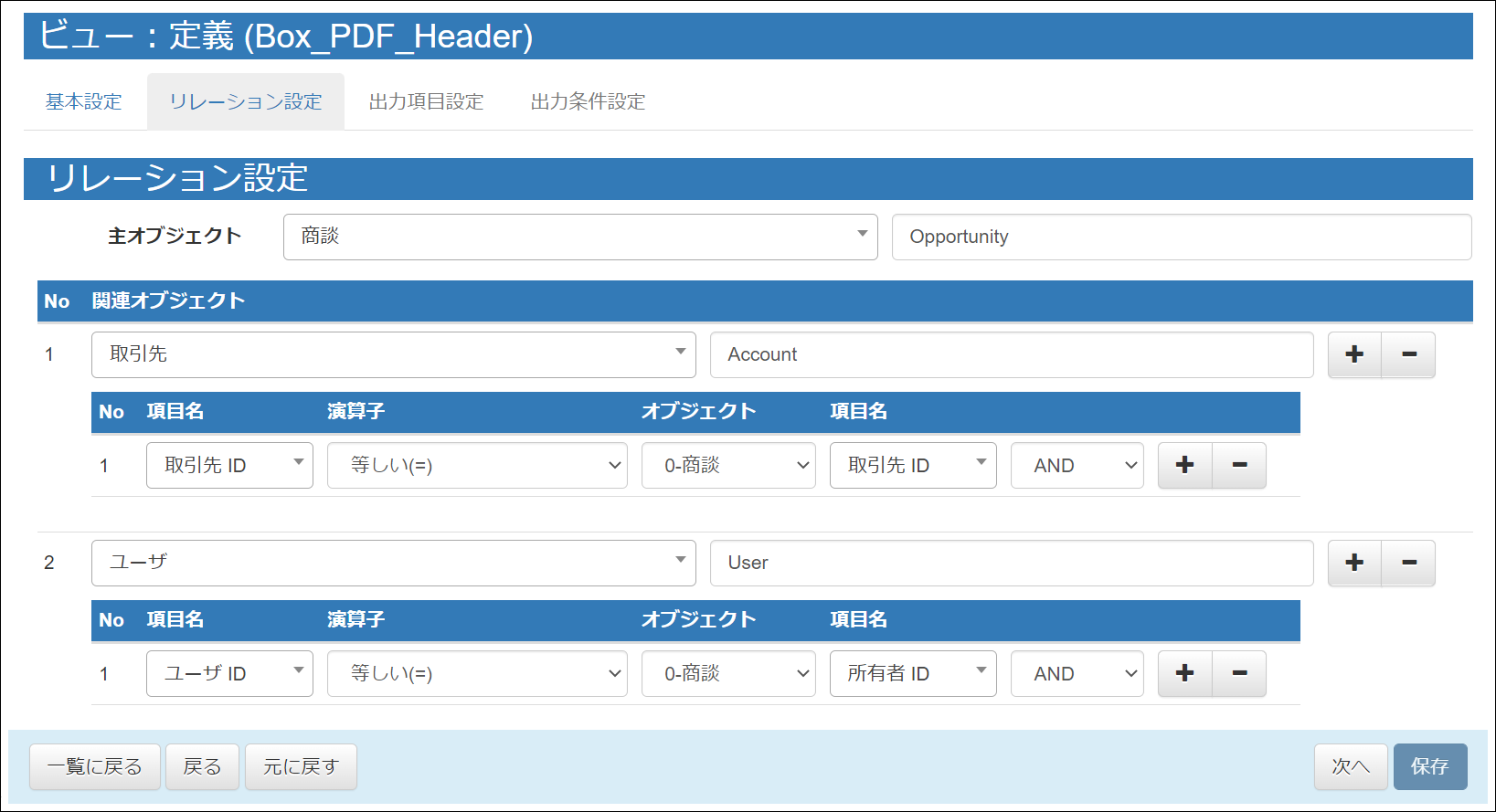 「商談」オブジェクトを選び、関連オブジェクトに「取引先」「ユーザ」を選びます。