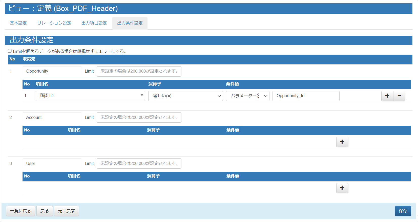 それぞれのオブジェクトについてどのようなレコードを取得するか、条件を指定します。