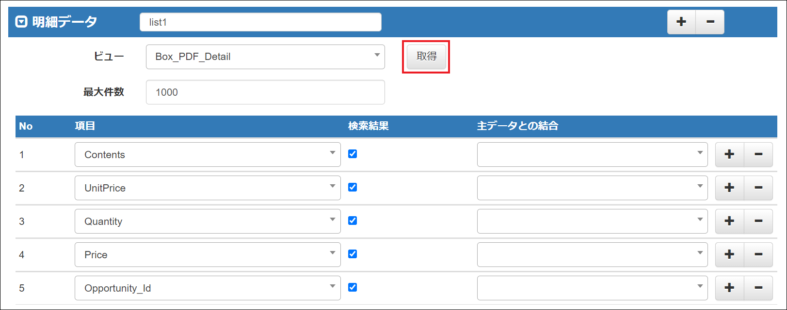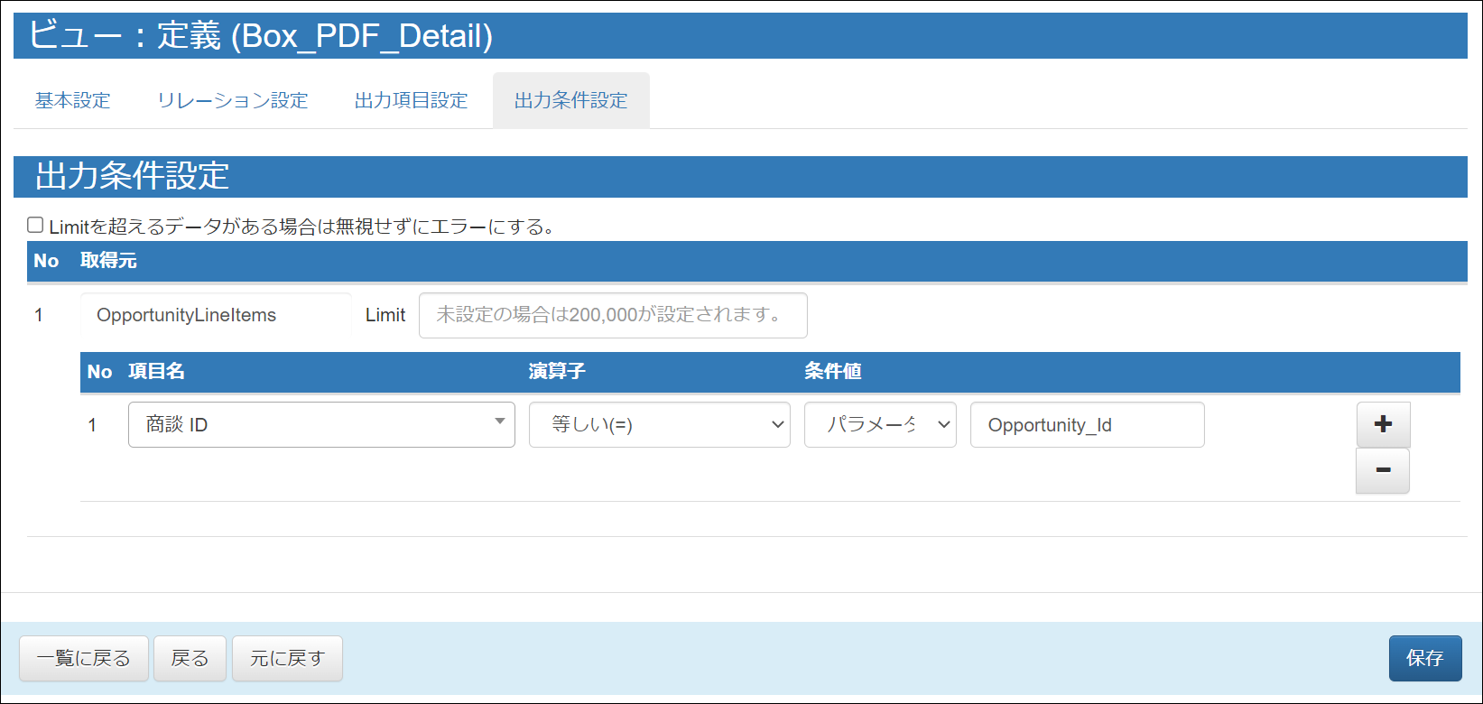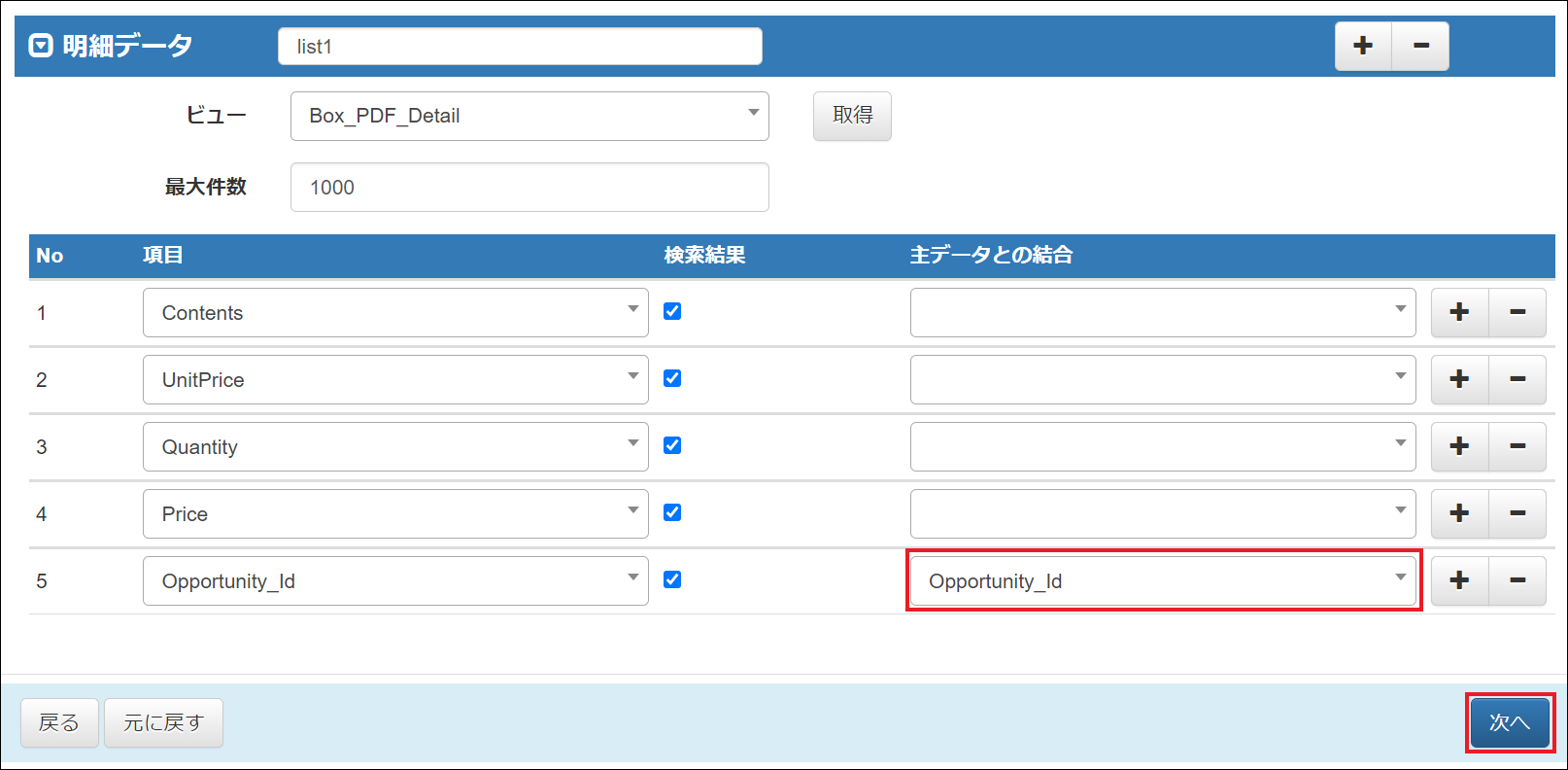 この設定により、明細ビューで取得した商談商品の情報がヘッダービューで取得した商談の情報と紐づけられます。
