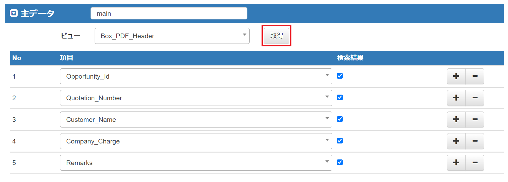 作成したビューを「主データ」「明細データ」の両方に選択して、それぞれ「取得」をクリックします。