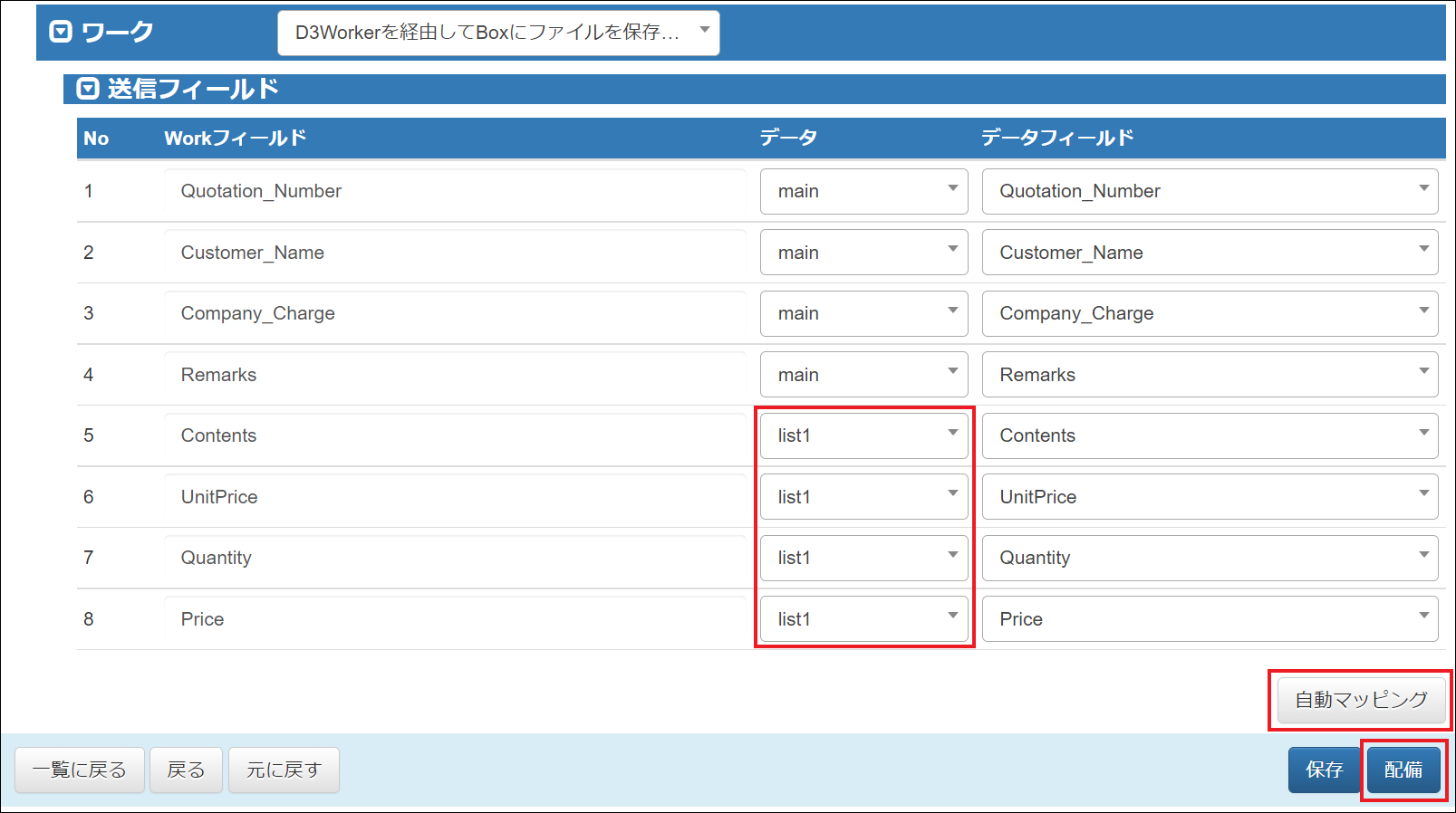 ここまでの設定で、ワークのデータソースの各フィールドとビューの項目名を同じに設定しているため、「自動マッピング」をクリックするだけでワークのフィールドとビューの出力項目の紐づけが完了します。