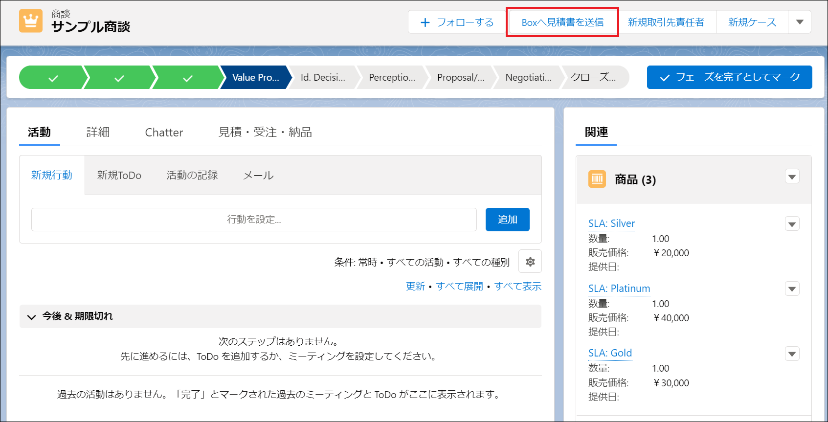 以上を設定したら、ボタンを設置した商談のレコード画面でボタンをクリックします。