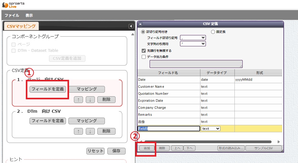 「フィールドを定義」をクリックして、CSV定義の「追加」をクリックします。