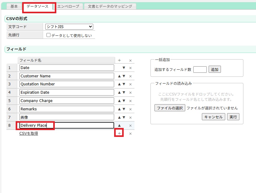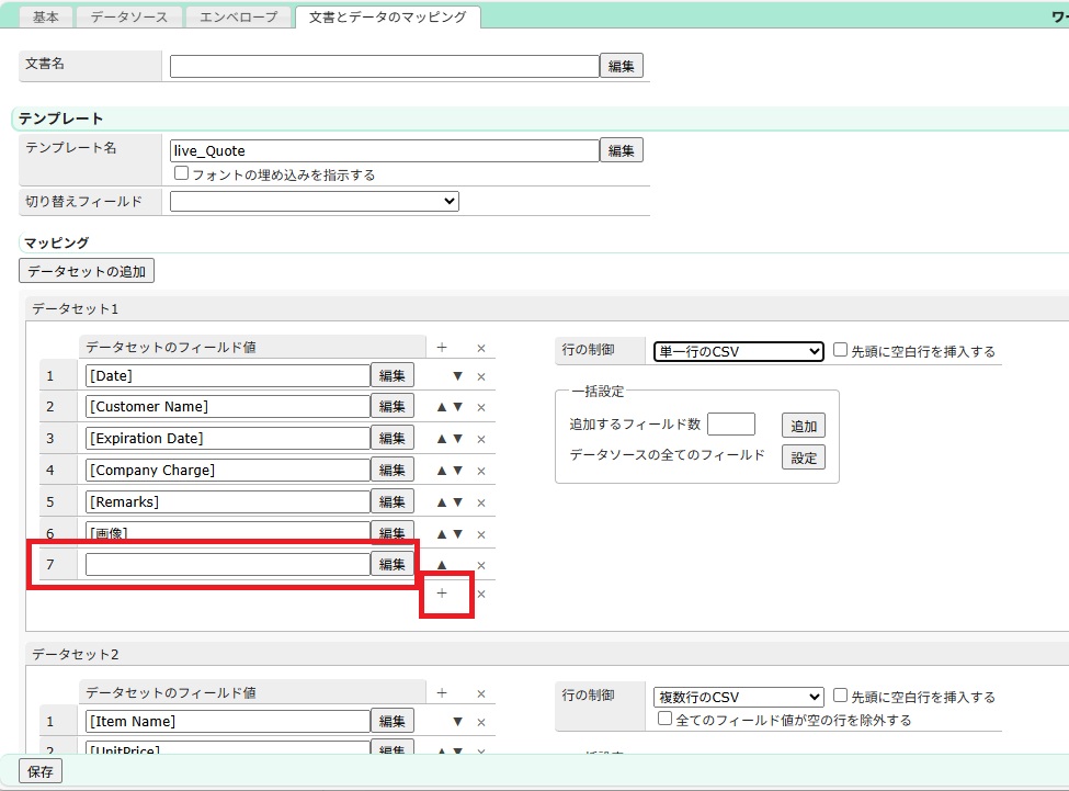 「文書とデータのマッピング」タブを開き、テンプレート側のデータセットのフィールド順と揃うように枠を追加します。