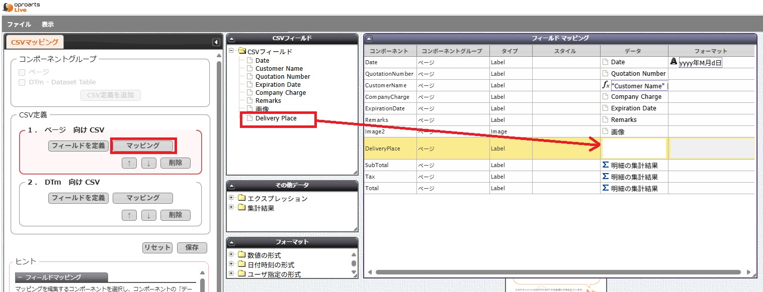 「マッピング」をクリックして、追加した動的なLabelをクリックします。「データ」欄に追加したフィールドをドラッグアンドドロップして紐づけます。