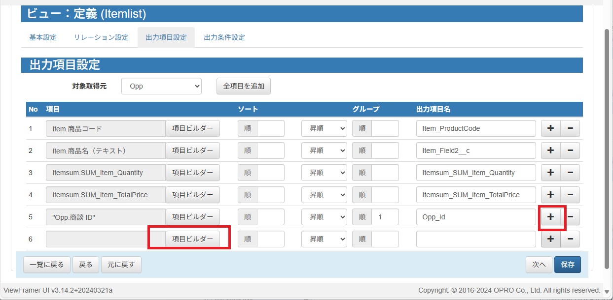 「出力項目設定」タブを開き、「+」ボタンで枠を追加して、「項目ビルダー」からSalesforceの項目を追加してください。