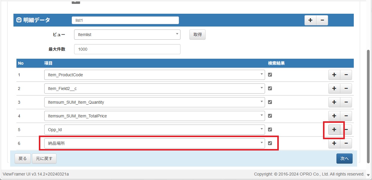 「+」で枠を追加して、選択リストからビューで追加したフィールドを選択します。