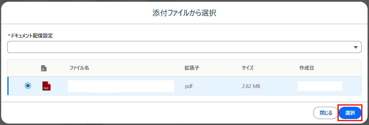 ②使用する配信設定を指定し、配信する添付ファイルにチェックを入れた状態で、「選択」ボタンをクリックします。