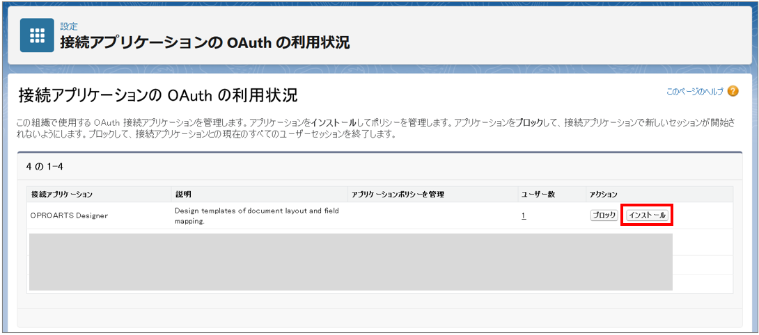 - 「接続アプリケーションの OAuth の利用状況」を検索して開きます。