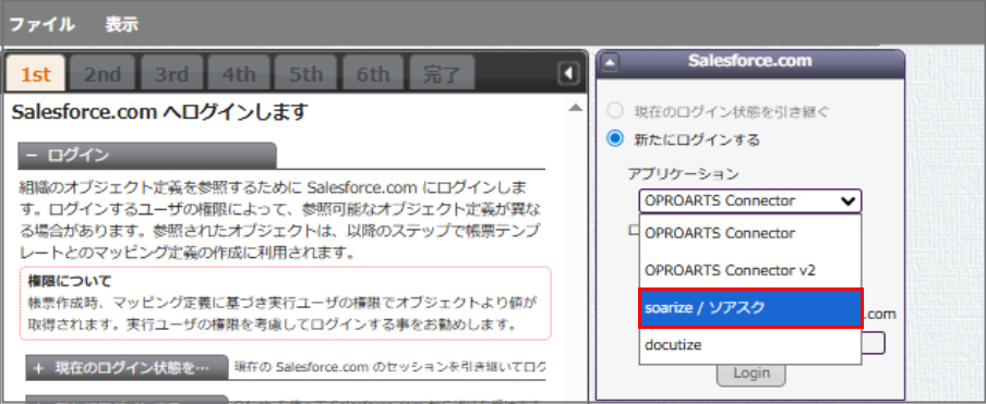 今後 OPROARTS Designer でログインする際に、「アプリケーション」のドロップダウンで「soarize / ソアスク」を選択する必要があります。