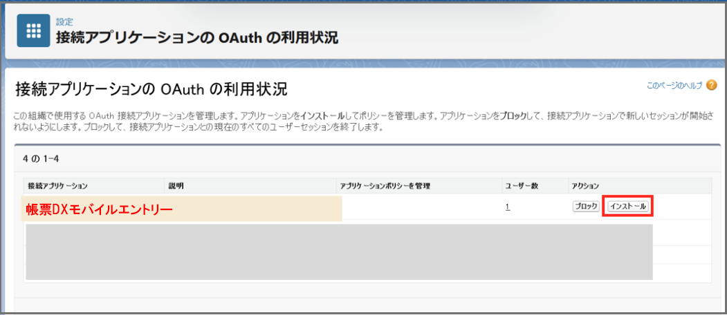 3.Salesforceにシステム管理者でログインし、[設定] > 「接続アプリケーションの OAuth の利用状況」で「帳票DXモバイルエントリー」「帳票DXモバイルエントリー Windows」の[インストール]ボタンをクリックする