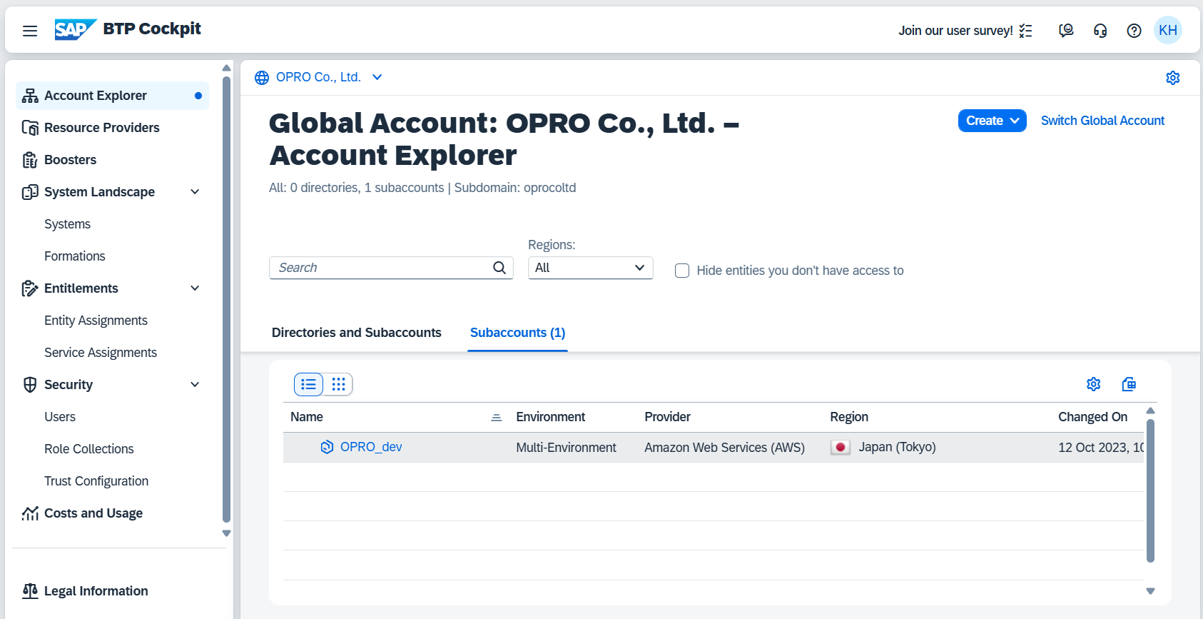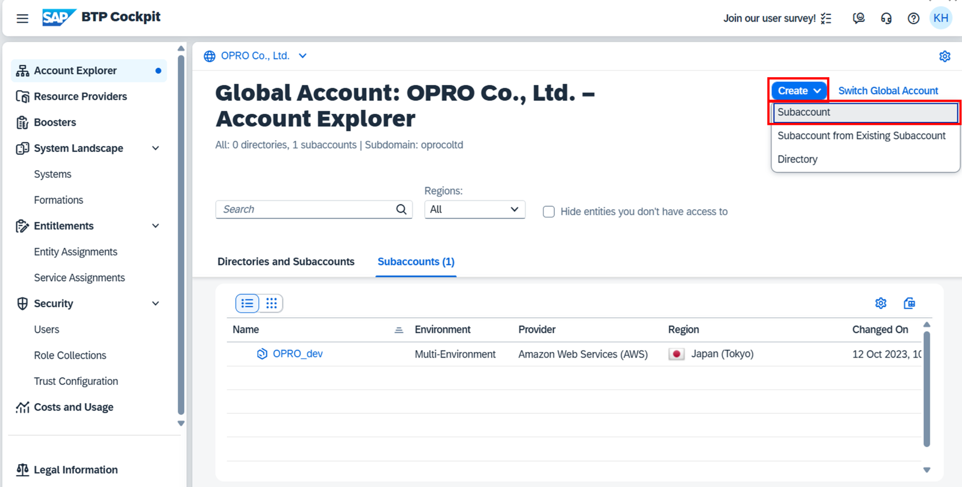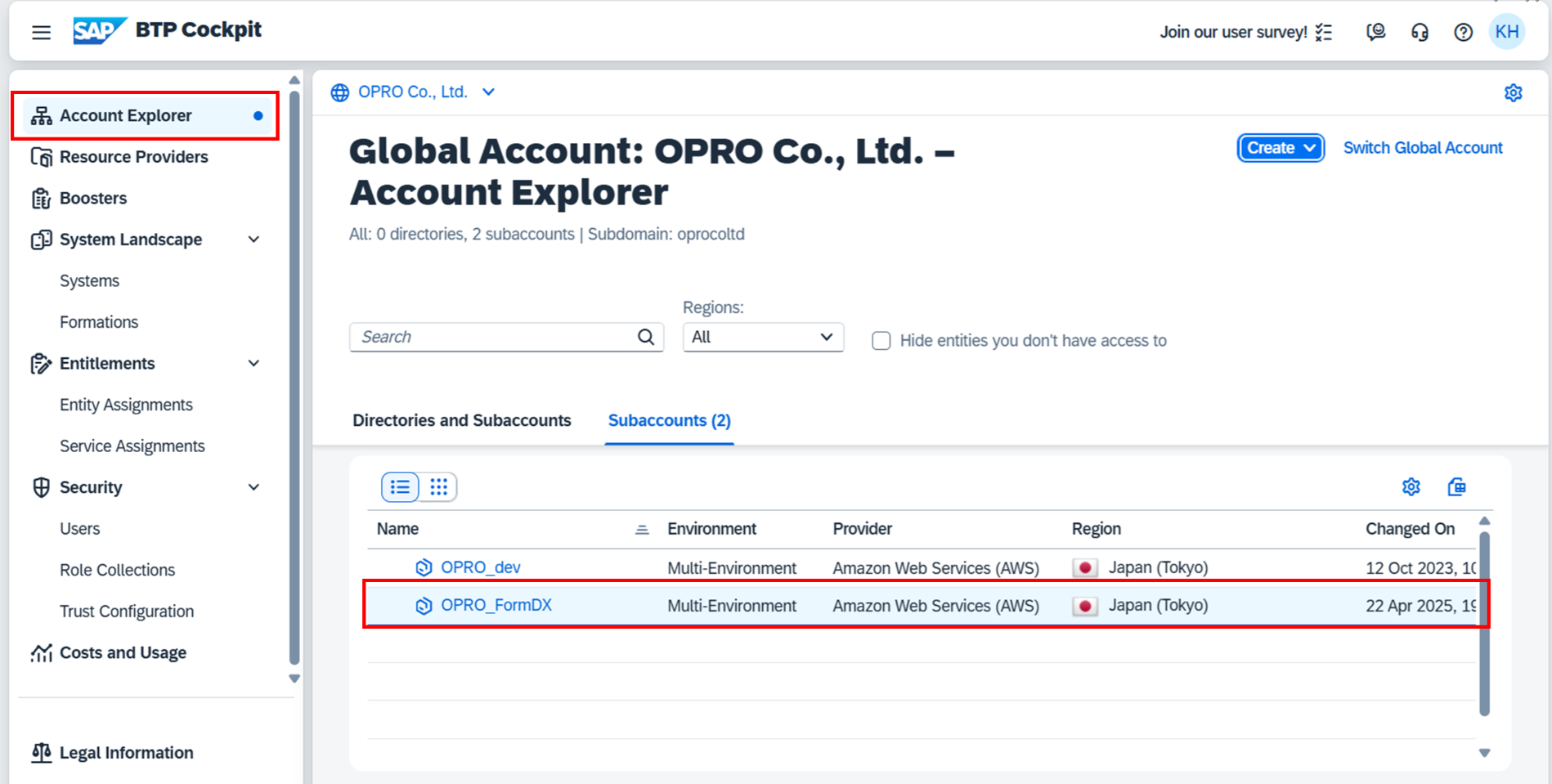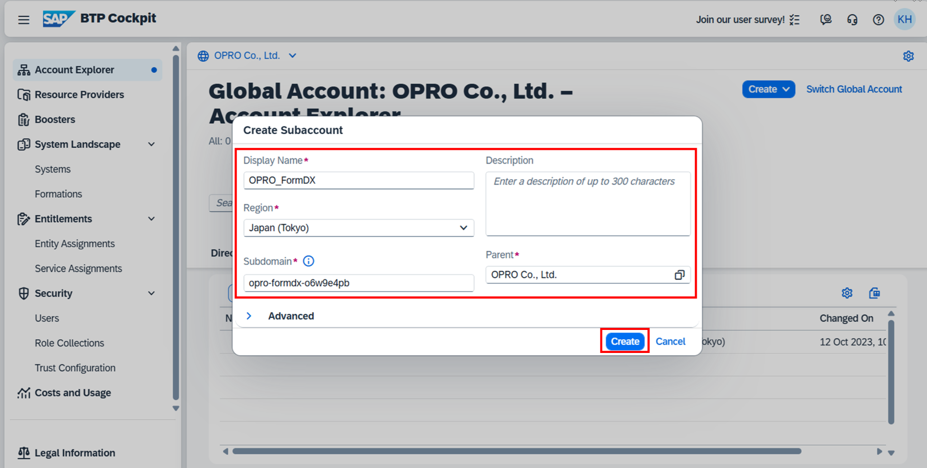 Display Name 任意 (例:OPRO_FormDX など) Region Japan (Tokyo) Subdomain (デフォルト) Description 任意 Parent (グローバルアカウントを選択) サブアカウントが作成されていることを確認する。