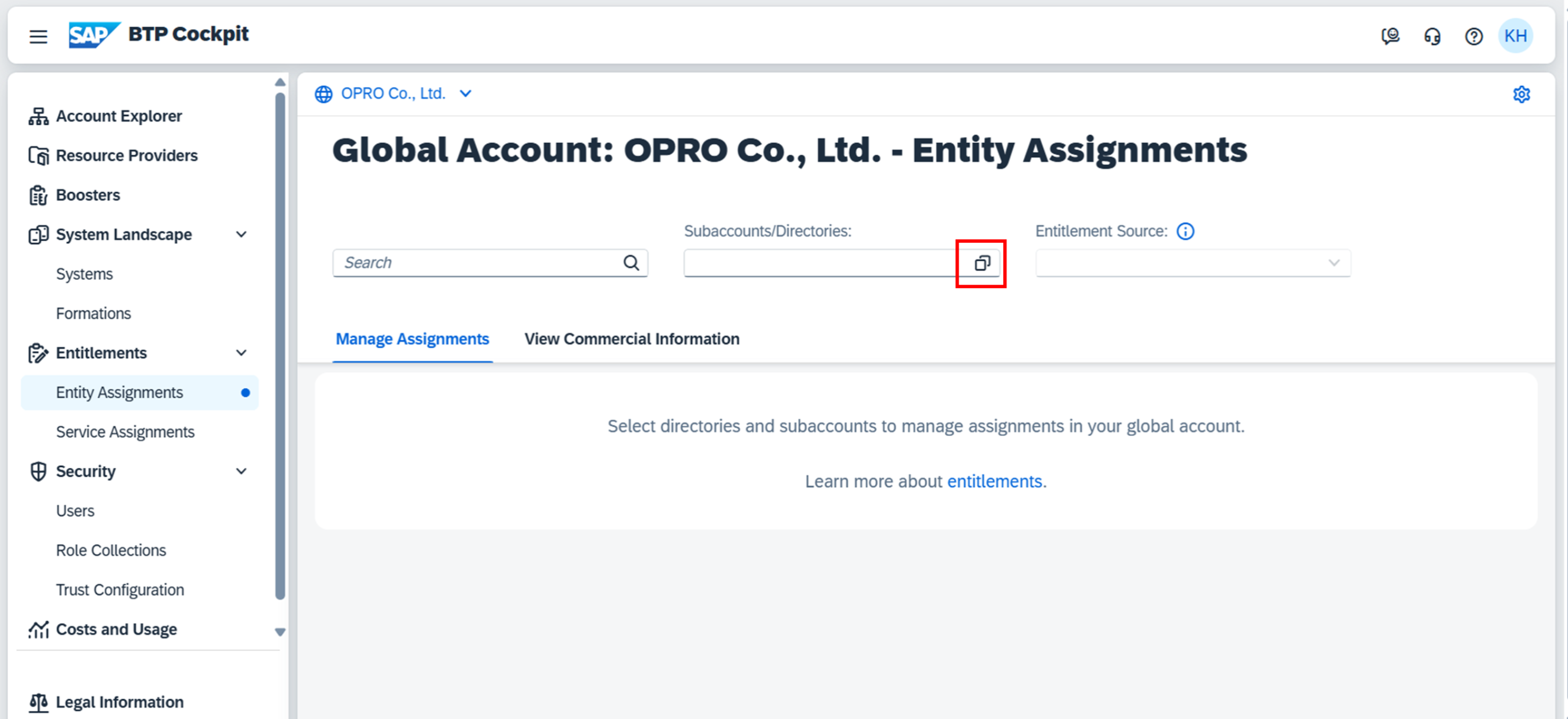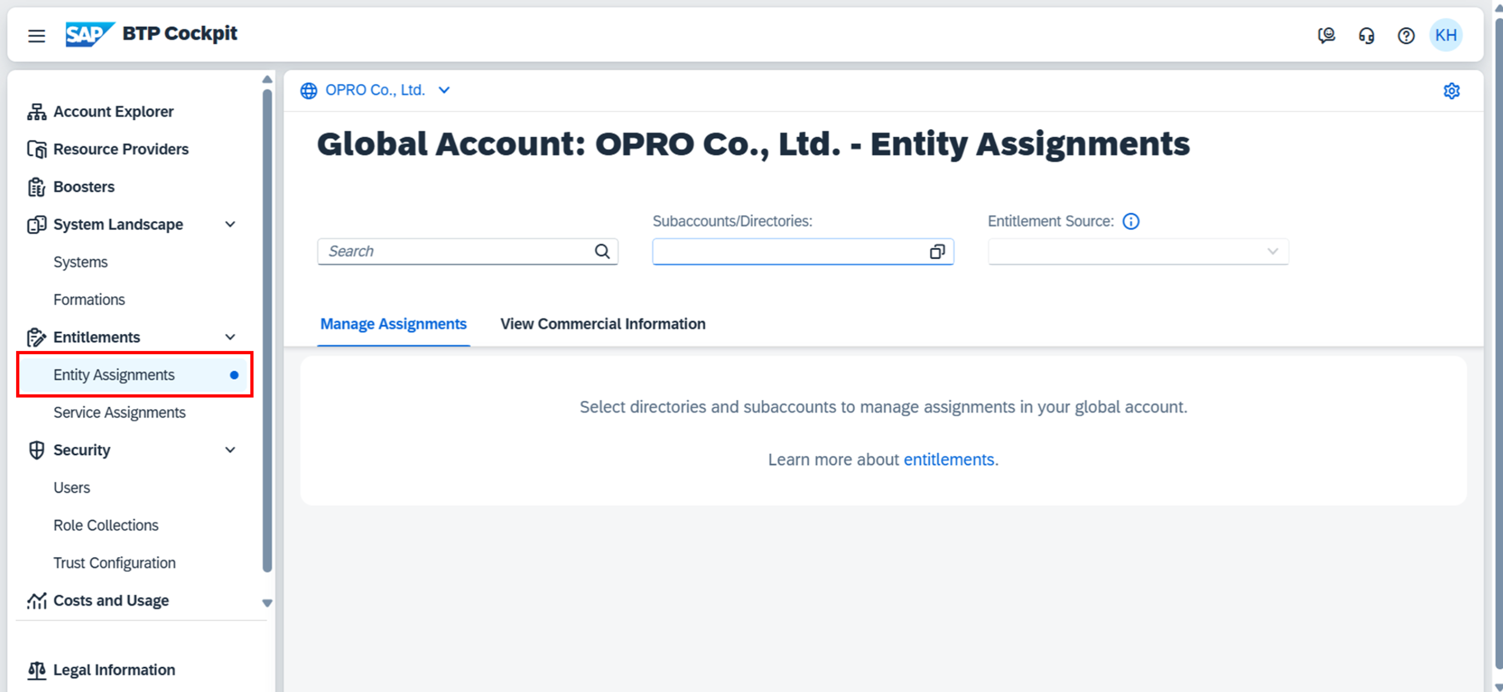 1. サブアカウントを作成できるユーザーでBTPへログインし、Entity Assignmentsを開く。