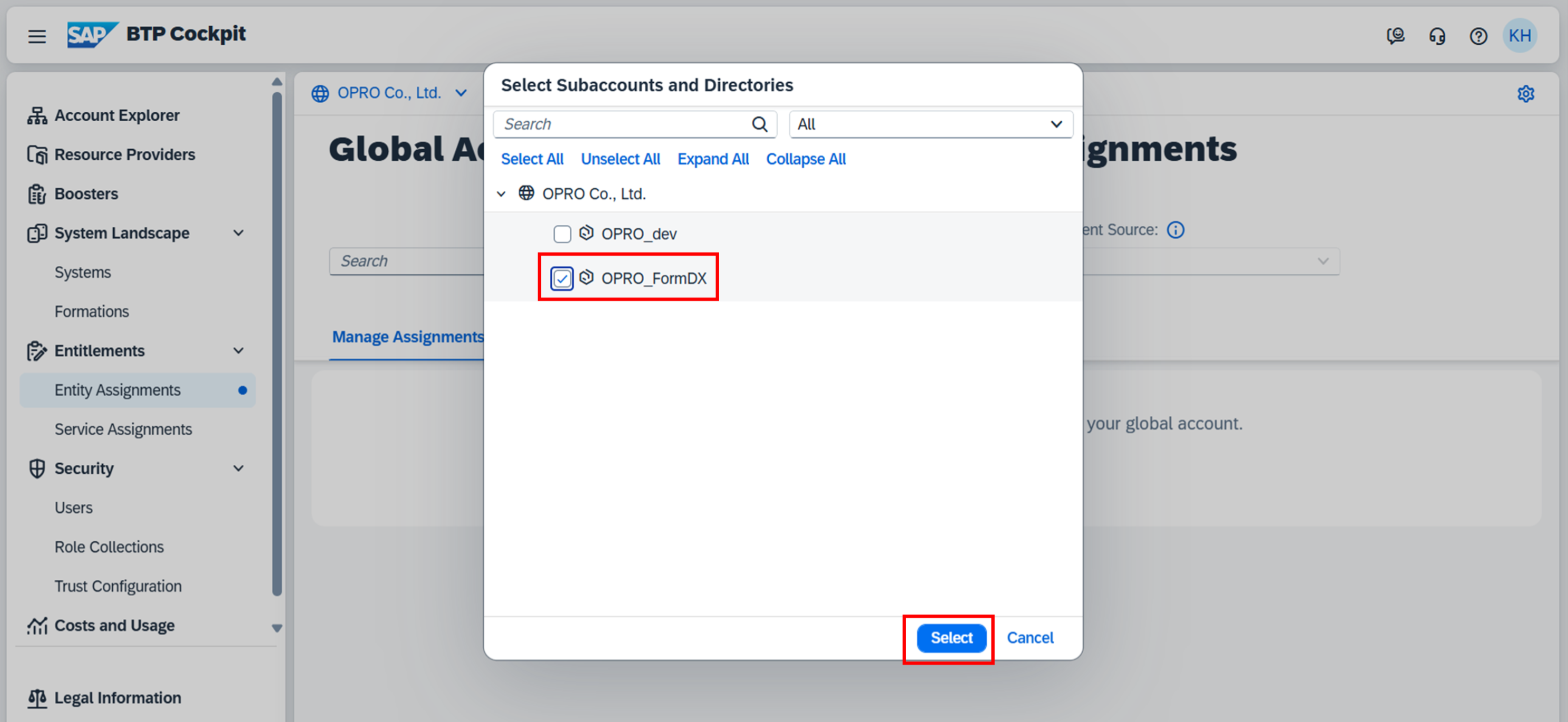 2.  4.BTPサブアカウント作成で作成した[Subaccount] を選択し、[Select] をクリックする。