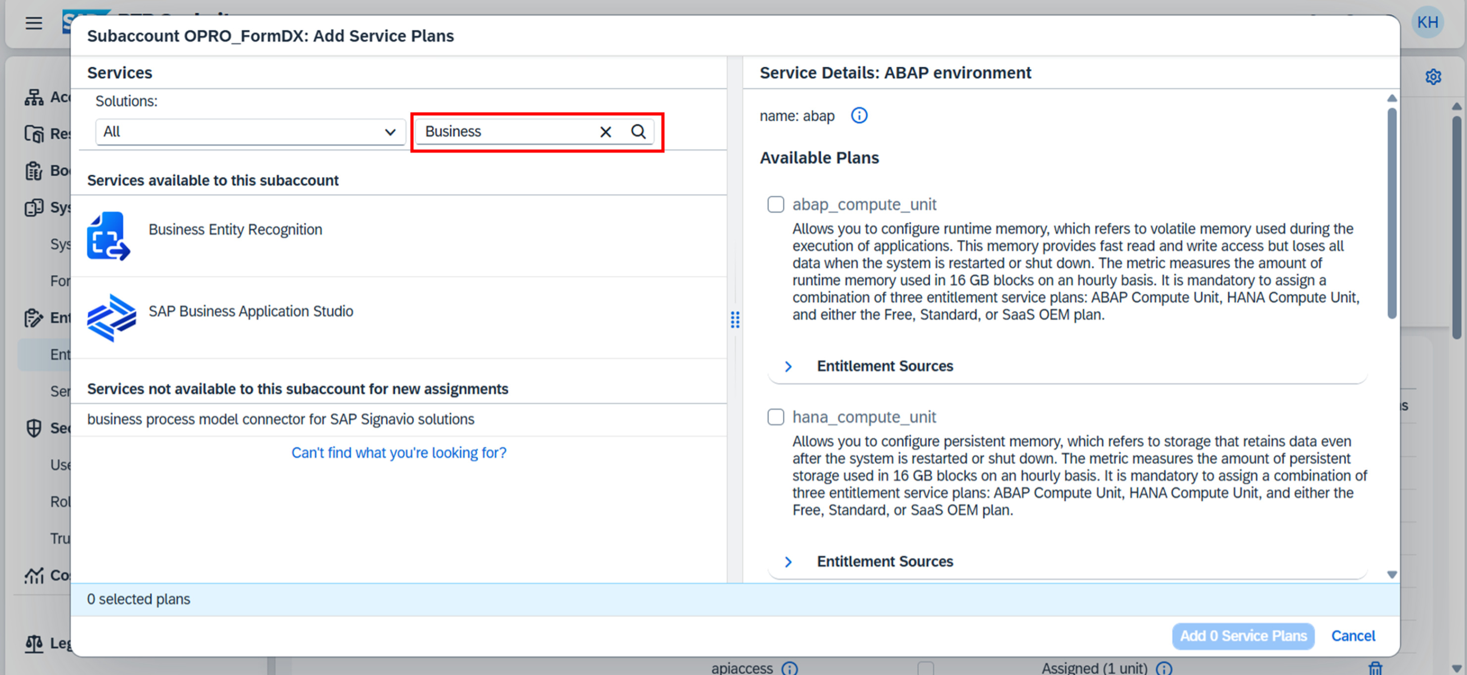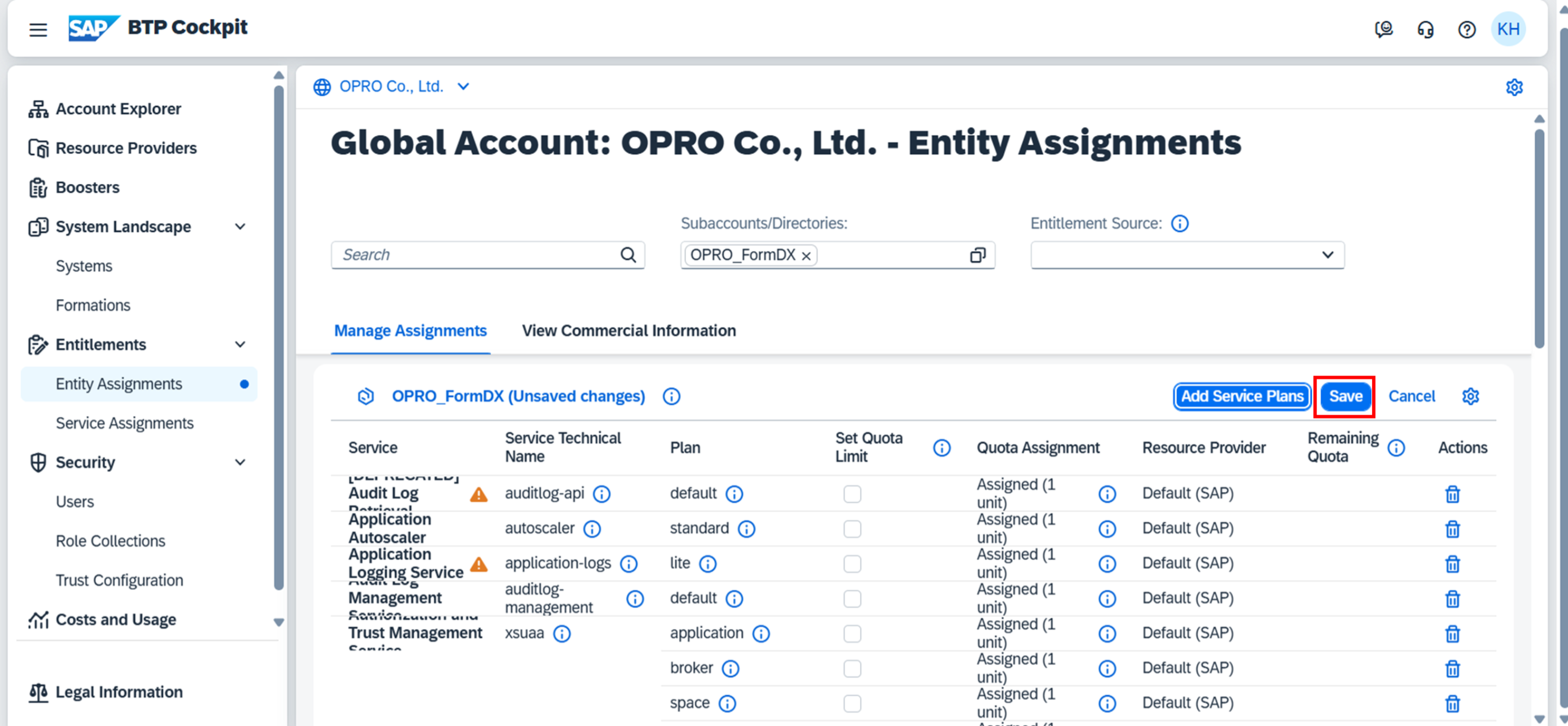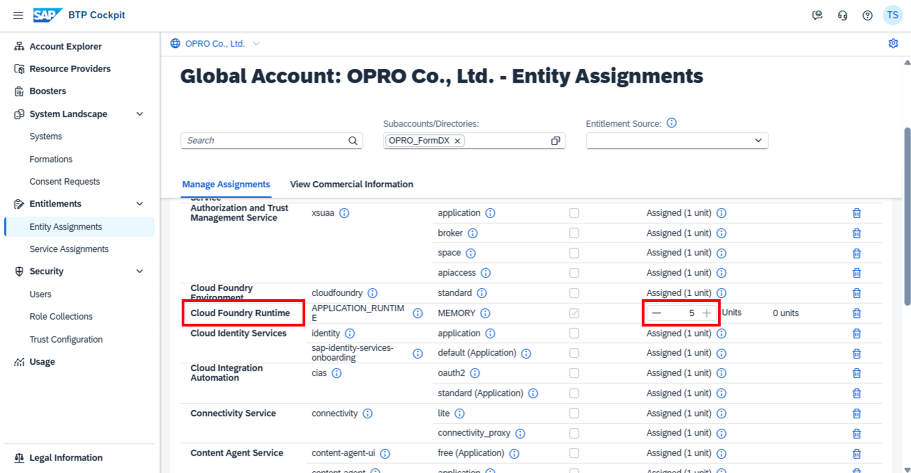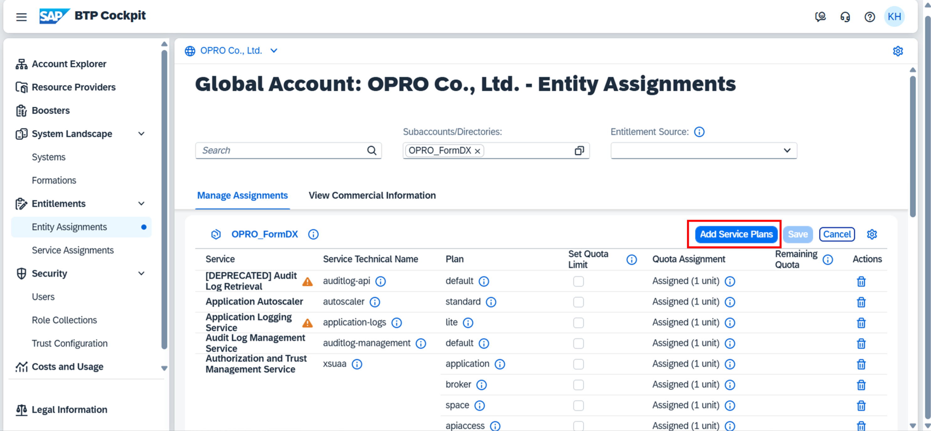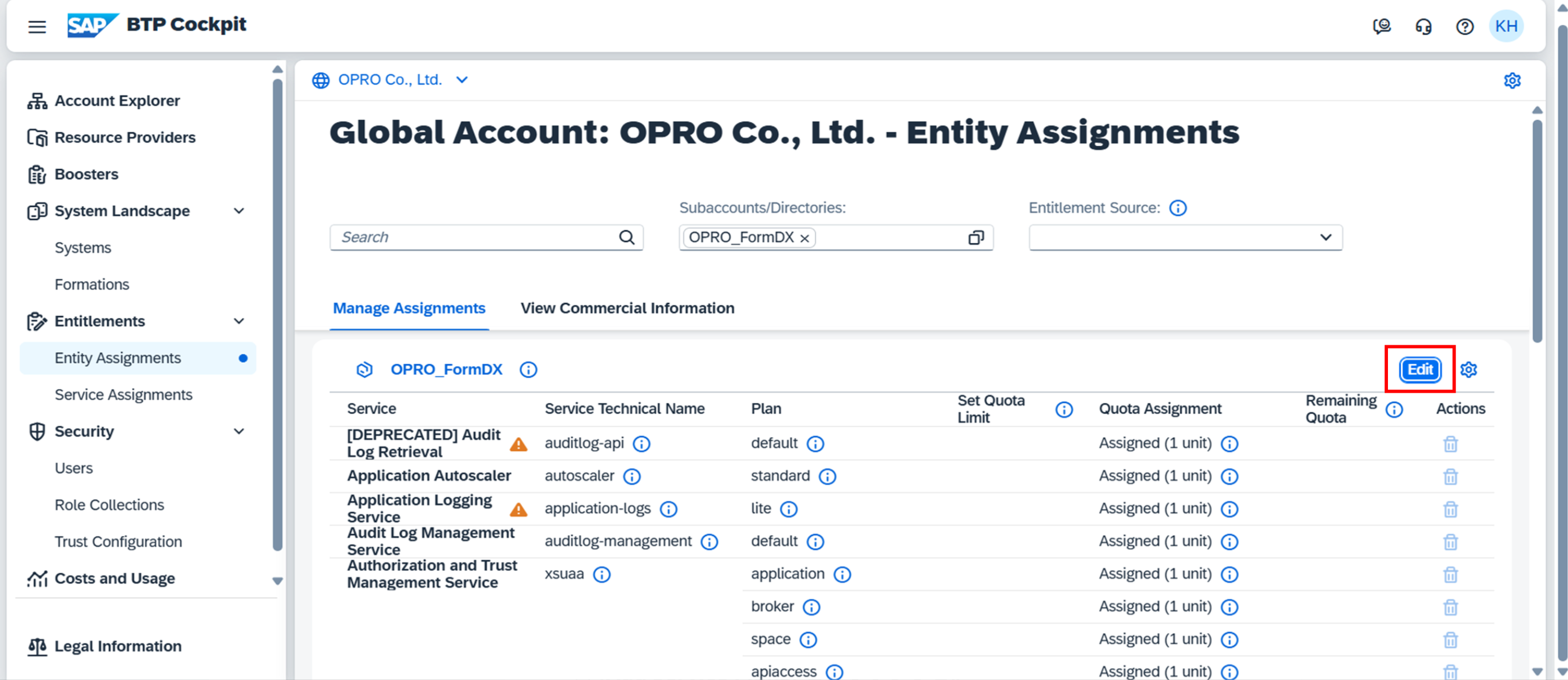 BTP>グローバルアカウント>Entitlements > Entity Assignments