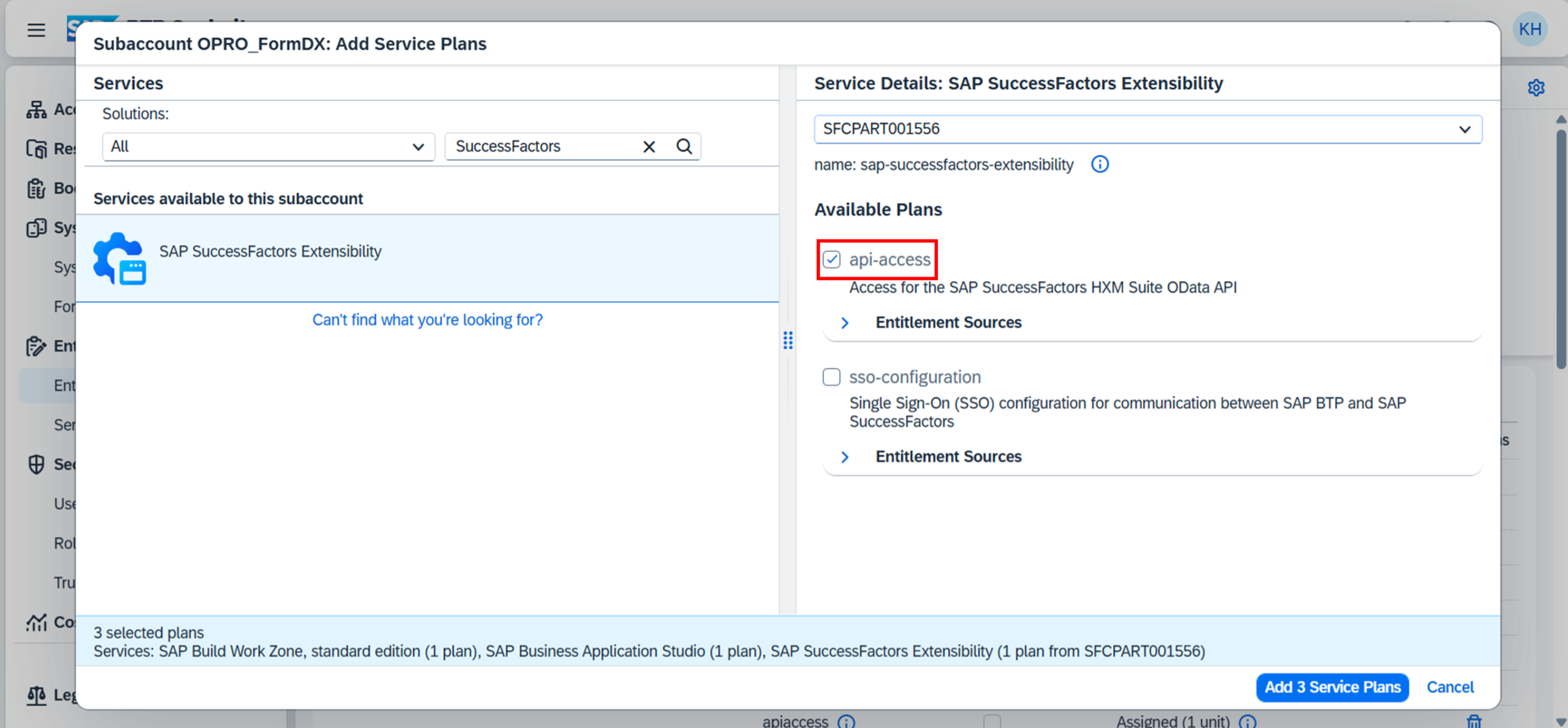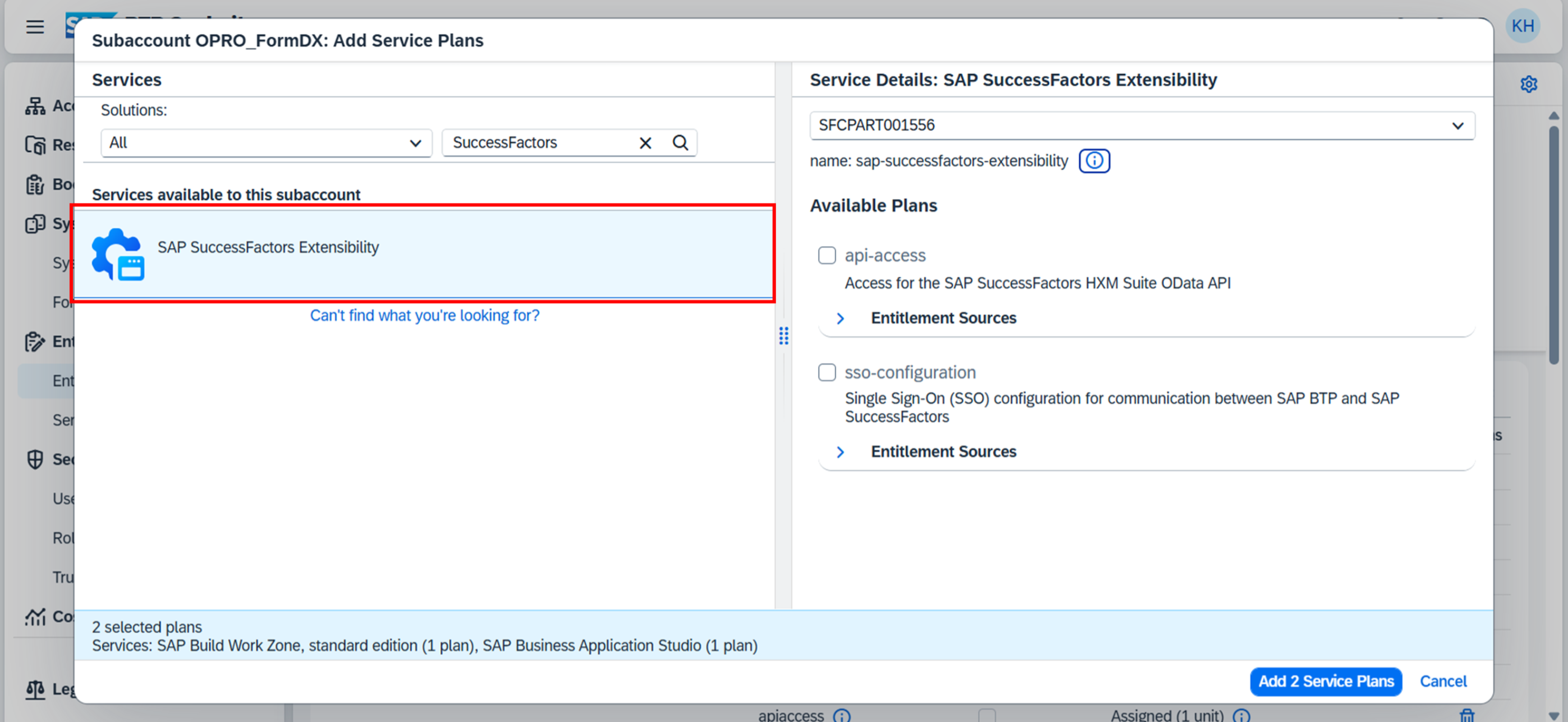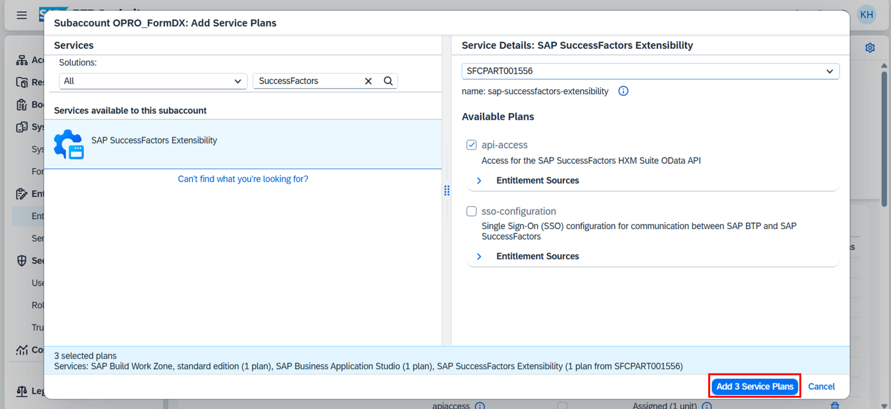 帳票DX for SAP (Connector for SuccessFactors)用のサブアカウントに使用するBTP上のサービスを割り当てる。