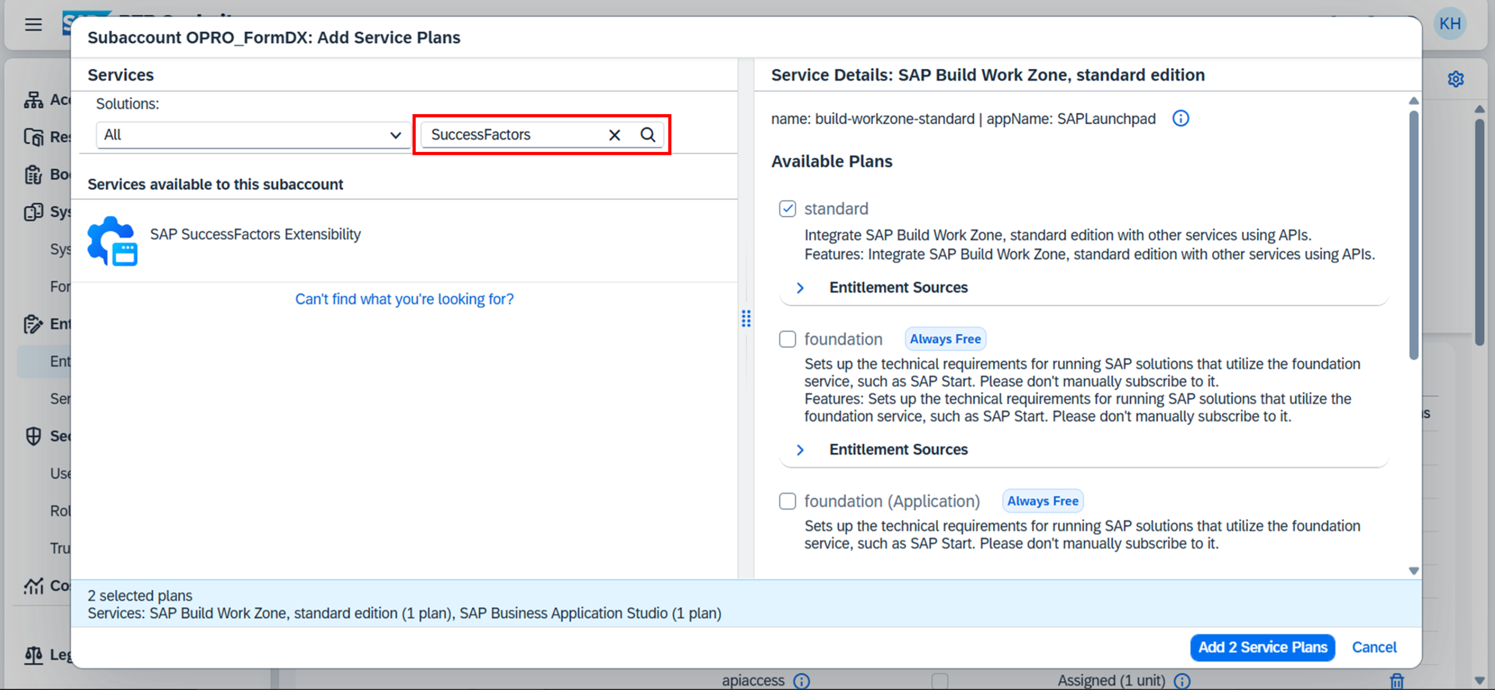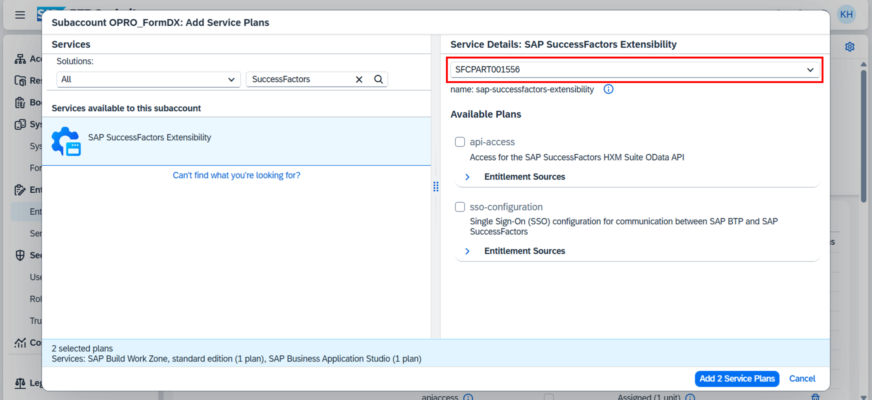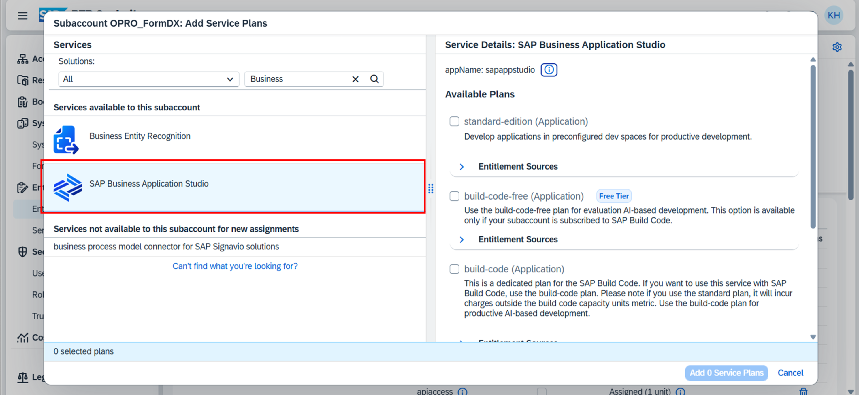 帳票DX for SAP (Connector for SuccessFactors)用のサブアカウントに使用するBTP上のサービスを割り当てる。