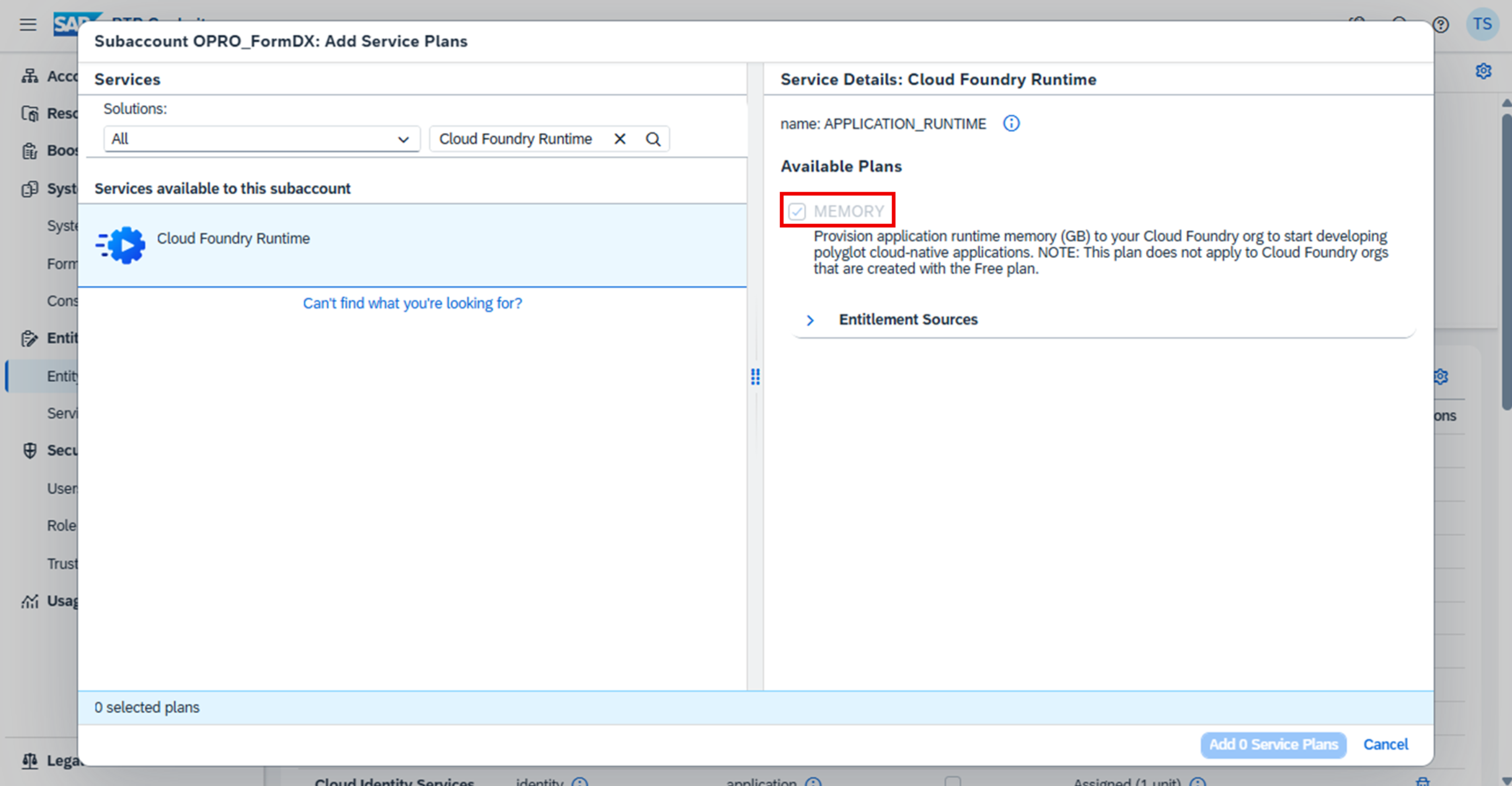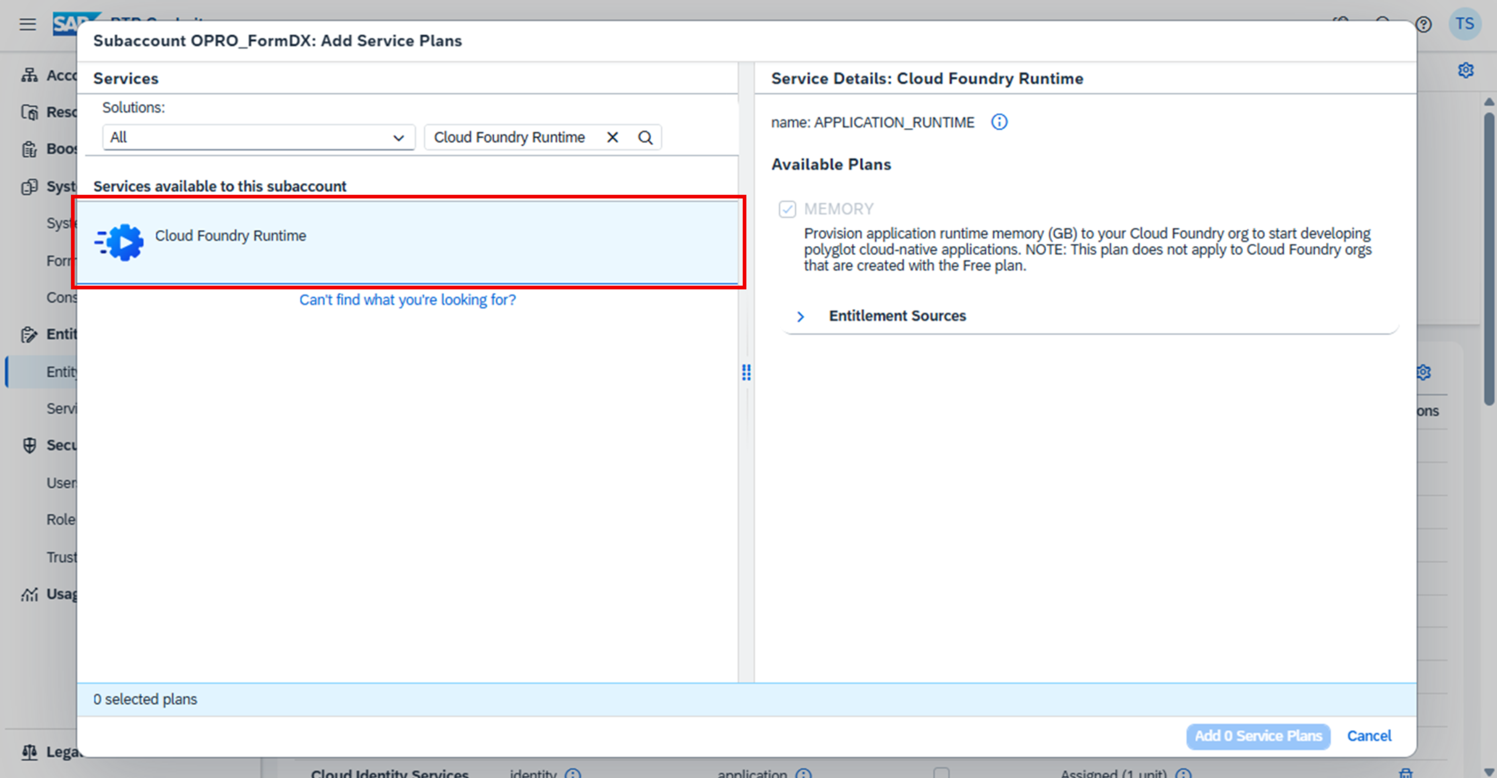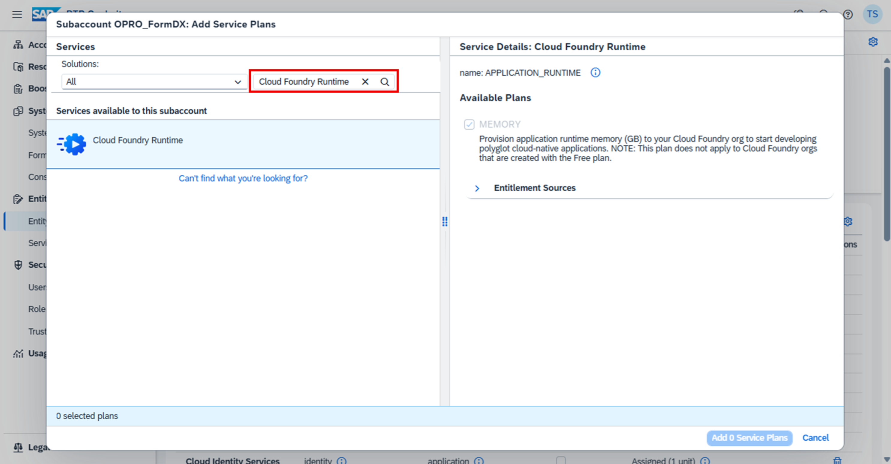 1. 検索エリアに ”Cloud Foundry Runtime” を入力する。