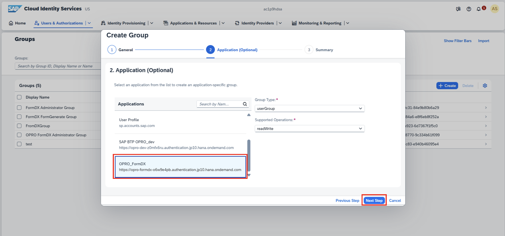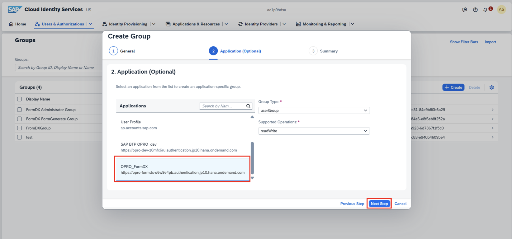 4. Applications から「OPRO_FormDX」を選択し、[Next Step] をクリックする。(右側はデフォルトから変更なし)