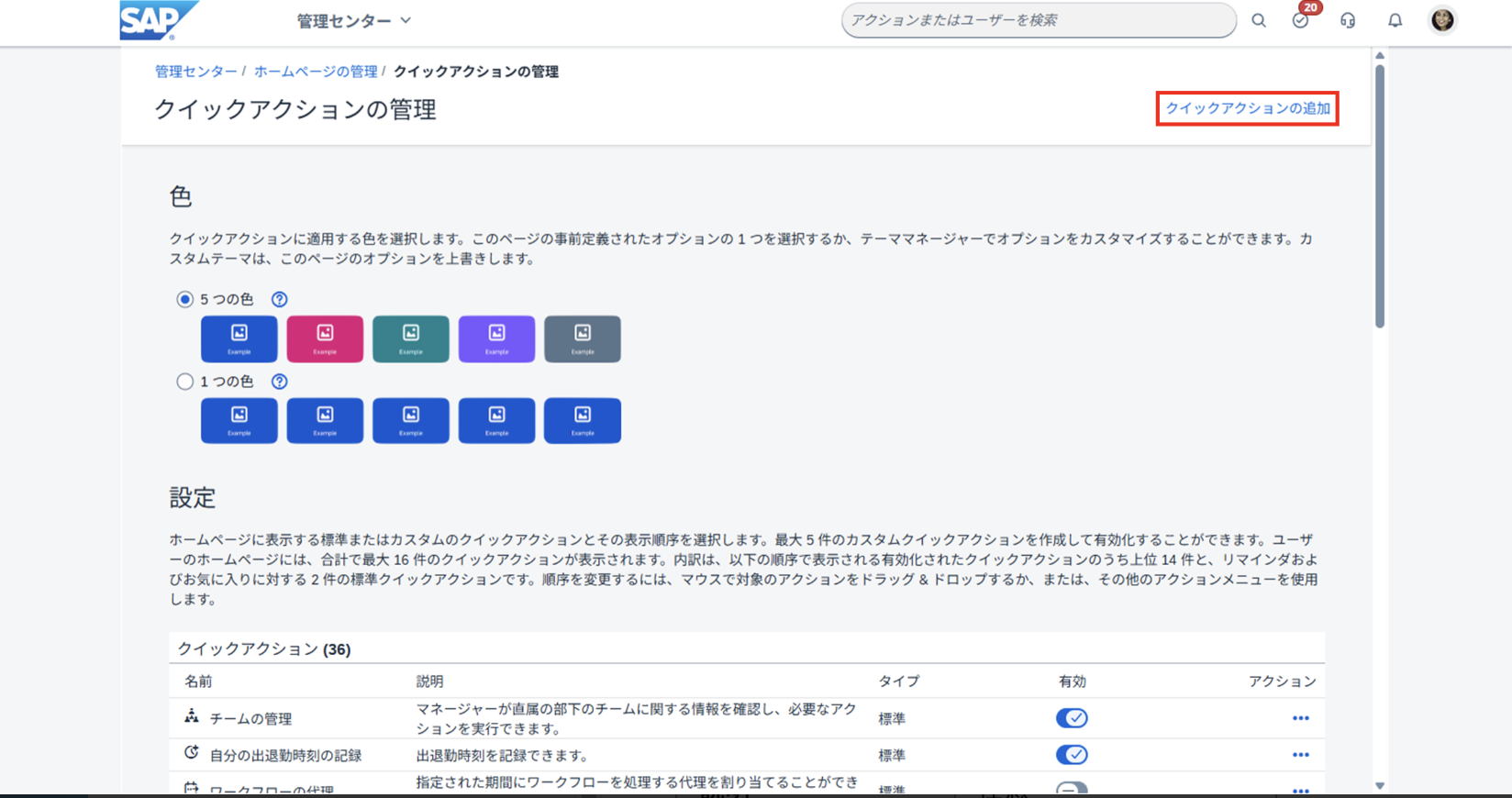 2. [クイックアクションの追加] リンクをクリックする。